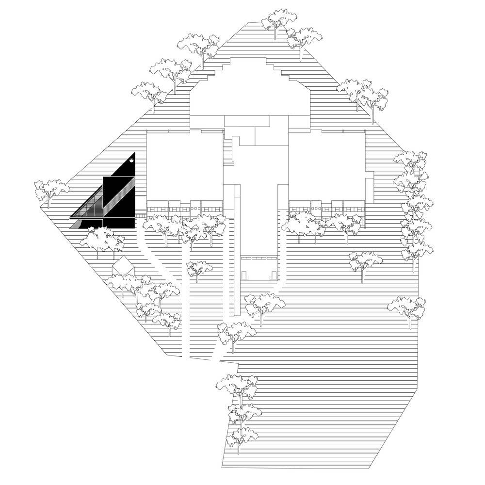 Externally, the pavilion stands out for its regular geometry and recurring triangular shape, giving the volume a distinctive and autonomous appearance. This design approach not only enhances the visual impact of the pavilion but also establishes a harmonious relationship with the landscape and surrounding structures, integrating coherently into the environmental context while asserting its unique presence.