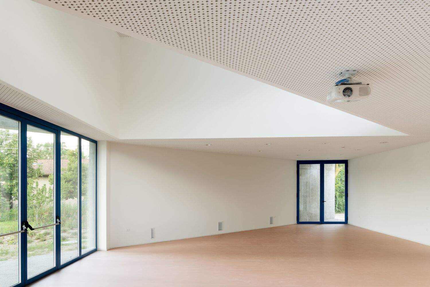 展馆通过一条作为托儿所新入口的通道与现有建筑相连,即使在课外活动期间也可独立使用。它由外露的钢筋混凝土建造,拥有一个120平方米的多功能厅,内部高度从3米到5米不等,营造出一种开放和明亮的感觉。