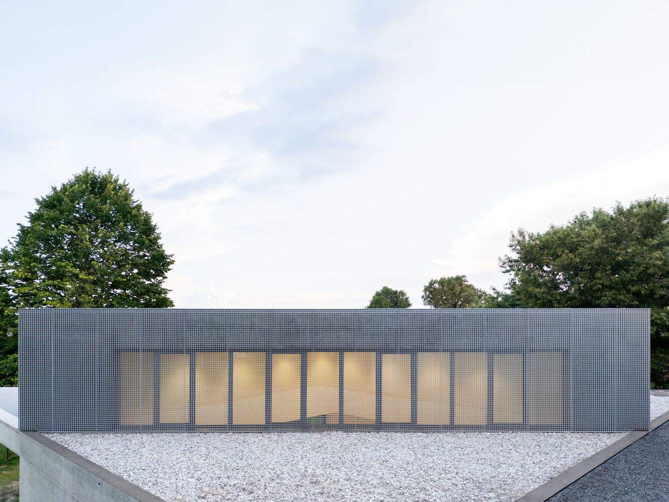 A large 7-meter window frames the surrounding landscape and connects the external portico with the interior. During local artist exhibitions or special events, the window can be shaded using a curtain system, while zenithal lighting is provided by a triangular shed roof.