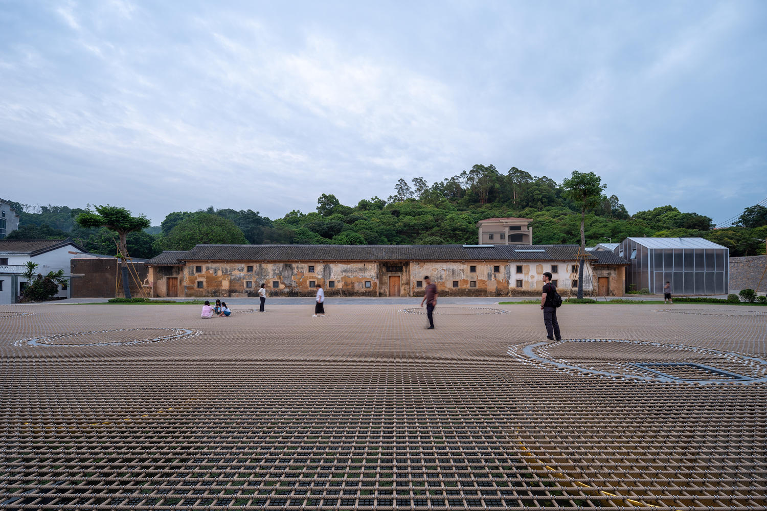 现场概述。长寿村位于深圳东北部的平山丘陵地带。演出场地位于江家客家楼,这是村里的一座传统建筑群。这座8000平方米的建筑建于清朝乾隆年间,以典型的广东住宅布局为特色,依山傍水。虽然部分房屋完好无损,但其他房屋已被拆除。长寿村的鸟瞰图揭示了其由农业根源形成的空间结构,显示了每户独立的房屋系统、狭窄的道路和缺乏开放的公共空间。几十年来,由于市场经济的影响,原本狭窄的村庄入口、街道、小巷和池塘已经失去了聚集人们的魅力。