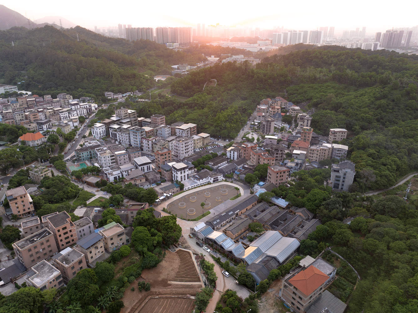 Site Overview. Changshou Village is situated in a hilly area of Pingshan in northeast Shenzhen. The performance venue is positioned in Jiang's Hakka Houses, a traditional architectural complex in the village. Built during the Qianlong period of the Qing Dynasty, this 8,000-square-meter compound features a typical Cantonese residential layout, nestled against a mountain and embracing a pond. While parts of the houses remain intact, others have been demolished. The aerial views of Changshou Village reveal its spatial fabric shaped by agricultural roots, showing independent house systems of each household, narrow roads, and a lack of open public spaces. Over the decades, the originally cramped village entrance, streets, lanes, and pond have lost their charm of gathering people due to the impact of the market economy.