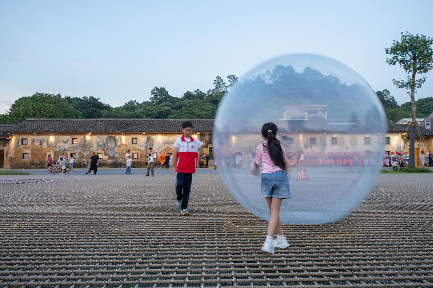 在绳网上移动需要平衡和谨慎。虽然网柔软安全,但其独特的网状结构要求人们谨慎行走,避免引发类似蝴蝶效应的摆动,创造出一种新颖的体验。由于绳网的独特特性,每个人的脚步都可以被自己和他人感受到,从而产生有趣的互动,并将被动感知转化为主动参与。随着人们适应绳网,他们被鼓励释放自己,自由探索。它不仅是一张横跨池塘的网,也是个体之间的纽带,在长寿村将欢乐和回忆编织在一起。这个“软广场”让人们暂时忘记自己的身份,模糊了彼此之间的界限。此刻,无论是城市人还是当地村民,每个人都在这张绳网上找到了归属感,与乡村互动。在这里,他们体验到平等和快乐,用温暖的问候彼此靠近。