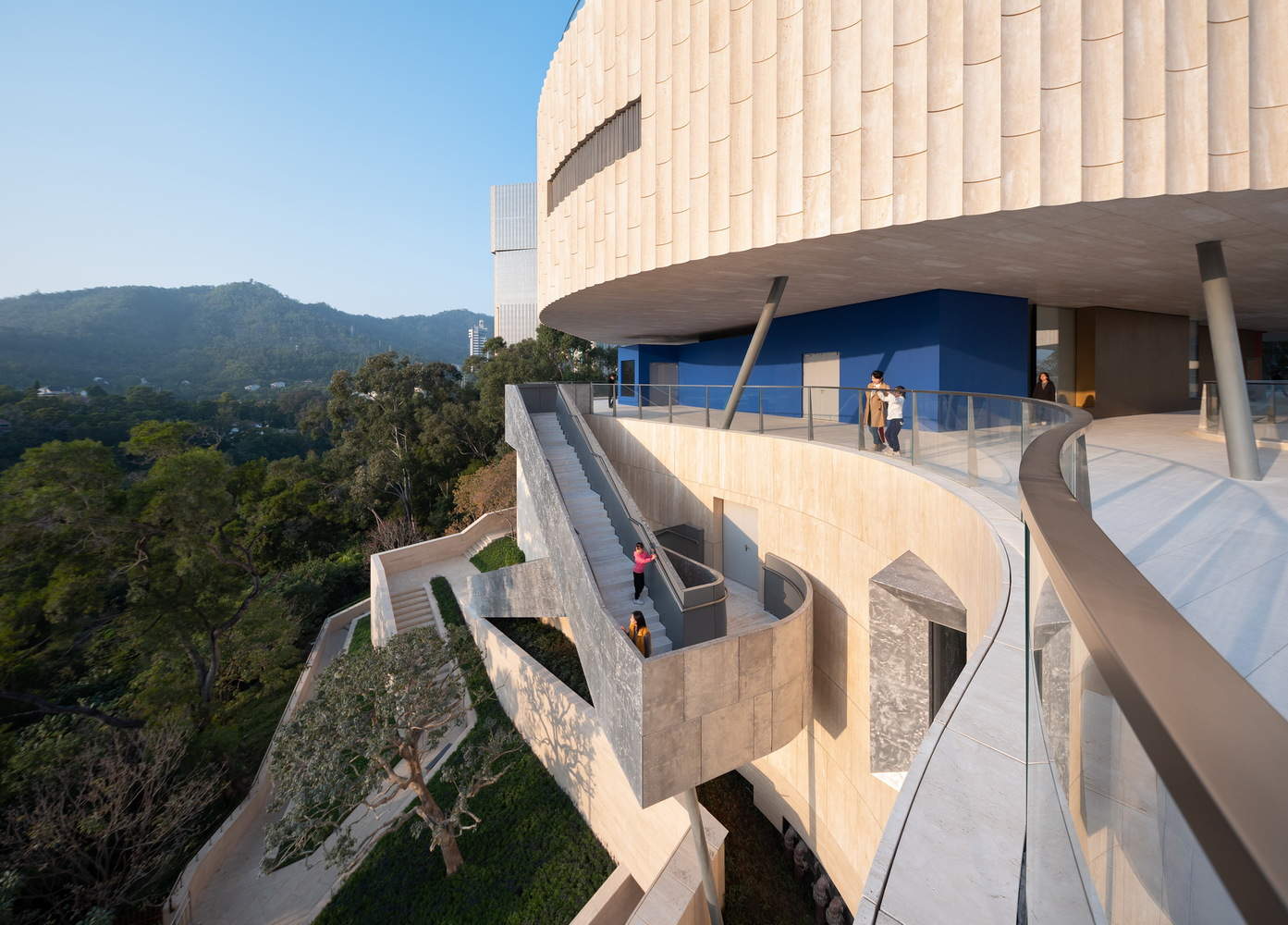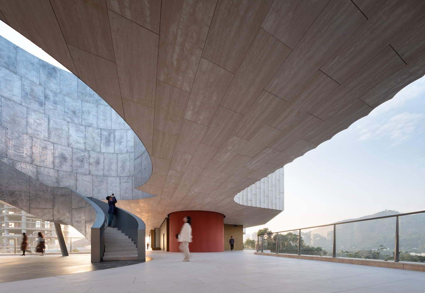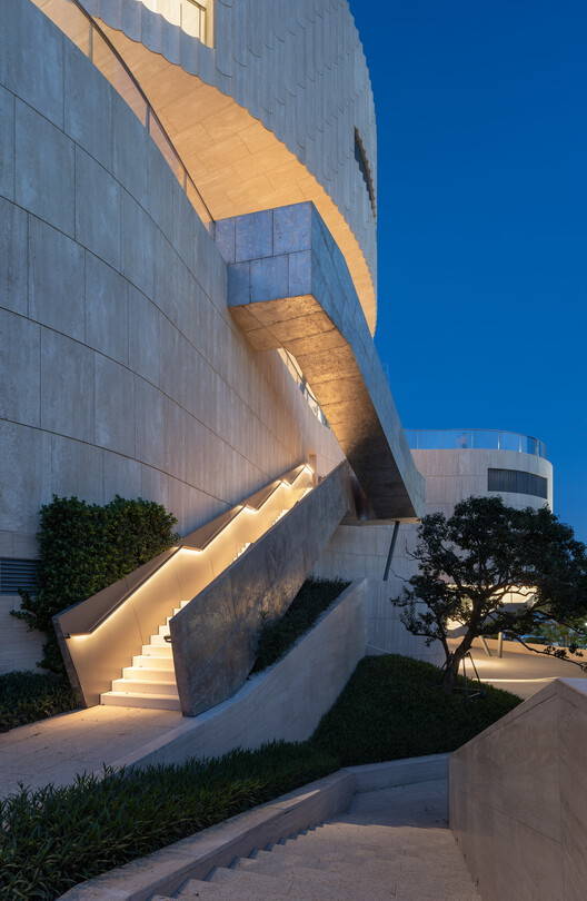 The museum's facade is primarily clad with white travertine. As parts of the building are embedded into the hill, it appears as a natural extension of the landscape. The interior materials and craftsmanship meticulously reflect the industrial history of the China Merchants Group, incorporating elements such as cast aluminum, steel, copper and concrete. The oversized entrance door is made of cast aluminum, and the walls of important spaces are cast with concrete that includes industrial components as part of the aggregate.