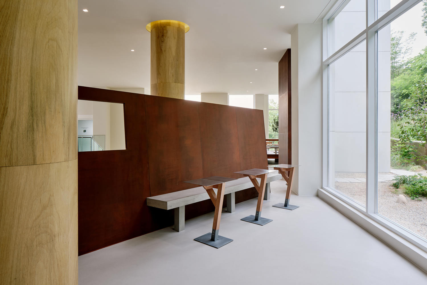 It uses materials and arrangements used outside such as concrete, cortene, and decoration materials to create the illusion of being in the back yard.