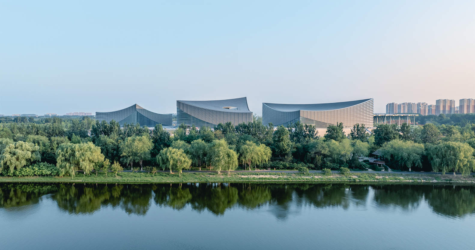 Designed to cultivate community while promoting the health and well-being of visitors and the environment, the project embodies the site’s storied history and its bright future in a subtle poetic expression. Conceived as lanterns for the performing arts, the buildings recall Tongzhou’s importance as a commercial shipping and storage hub by referencing the rooflines of the storehouses that formerly lined the canal’s banks and the sails of traditional canal boats. The forms simultaneously evoke a theater curtain parting at the beginning of a performance. A broad plinth, accessed from all directions by splayed steps and ramps, unifies the complex. This elevated platform extends the buildings’ lobbies into the surrounding forested park, setting up the relationship between the interiors, the landscape, and the Grand Canal.
