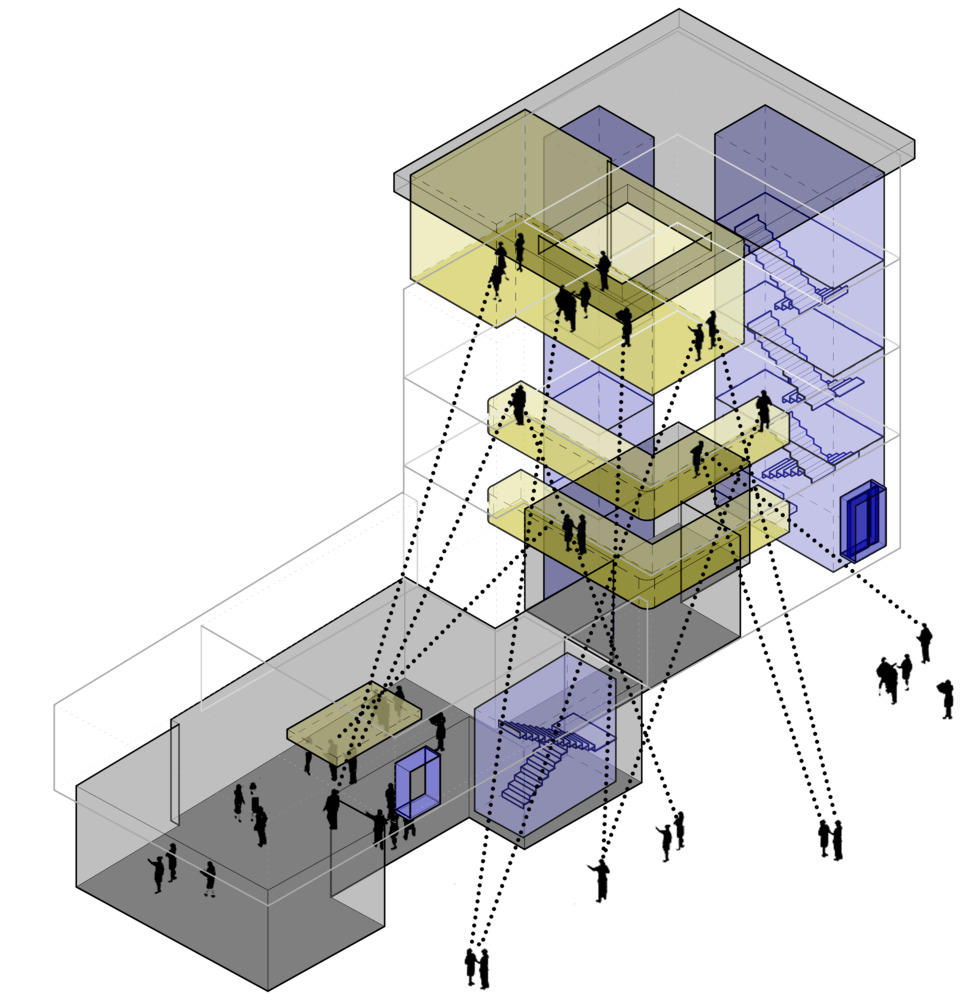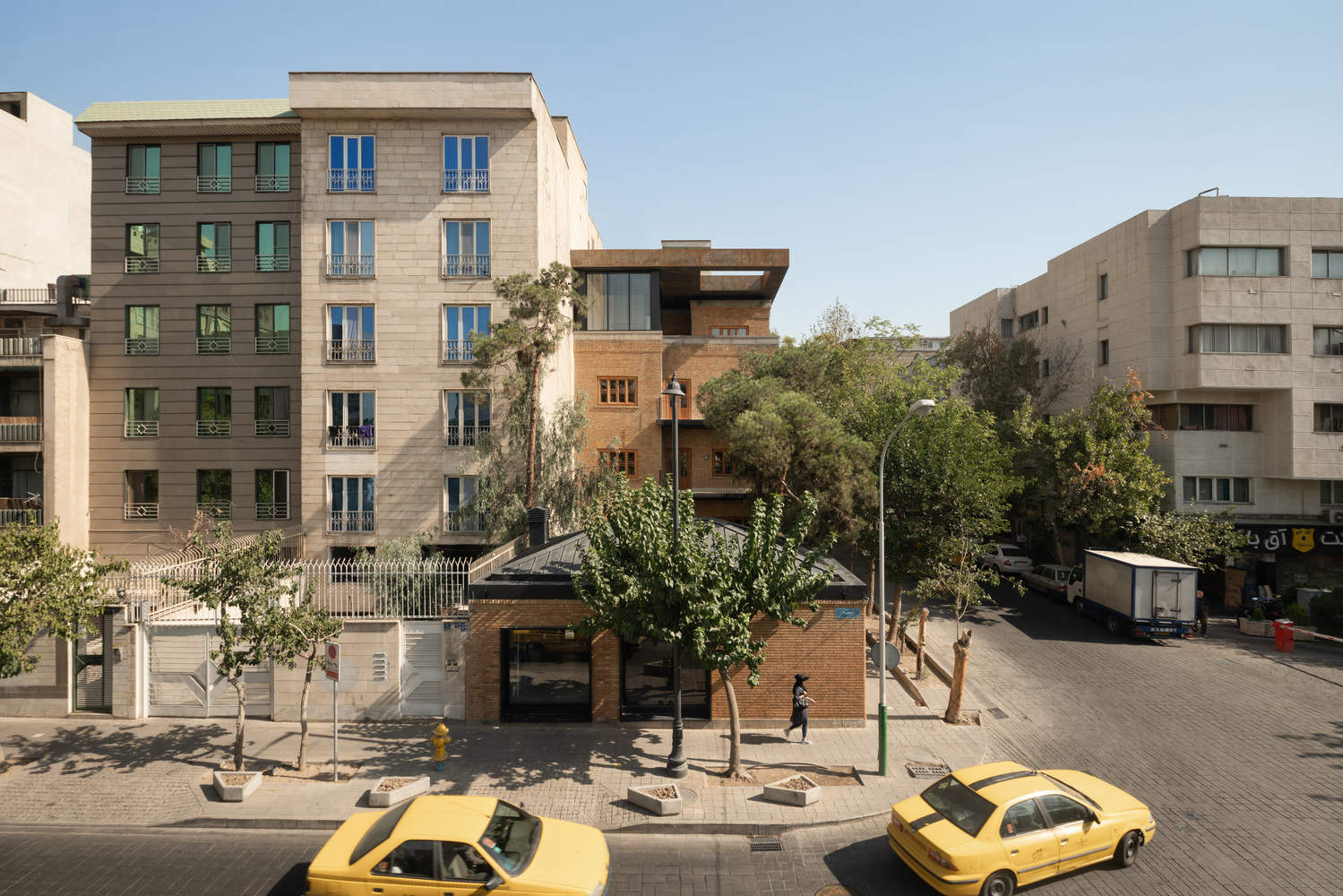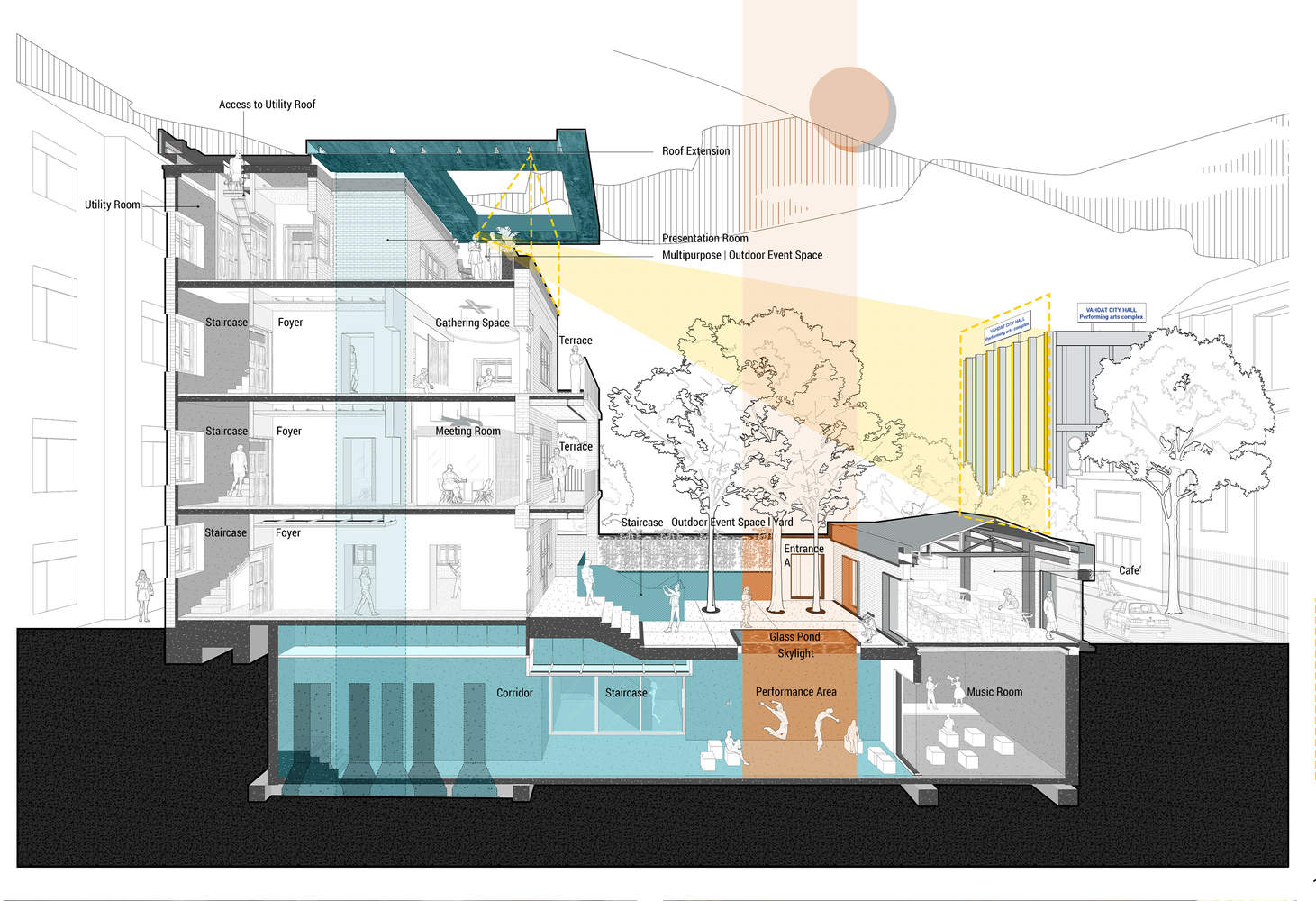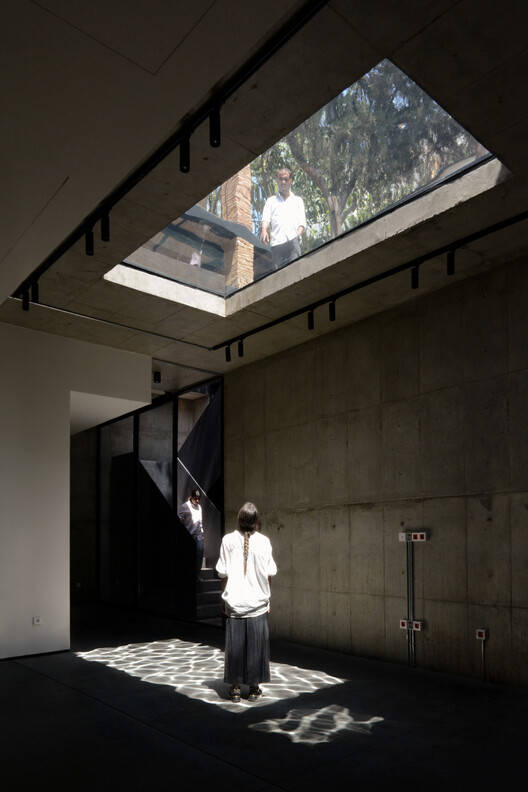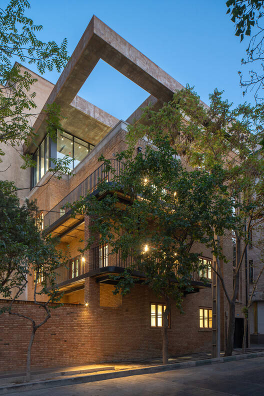 The project's unique geographical location in Tehran's cultural zone led the design approach towards focusing on creating a connection between this project as an urban node to the existing revitalization plan in the area by inviting the public to celebrate the art of performance also experience a sense of community and belonging for local performers and artists. To open the building to the neighborhood, the starting point of the spatial experience, the southern building was designed as a café with transparent openings, creating a visual connection between the main building and the street.