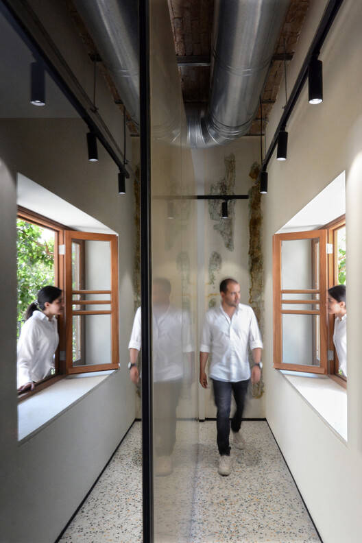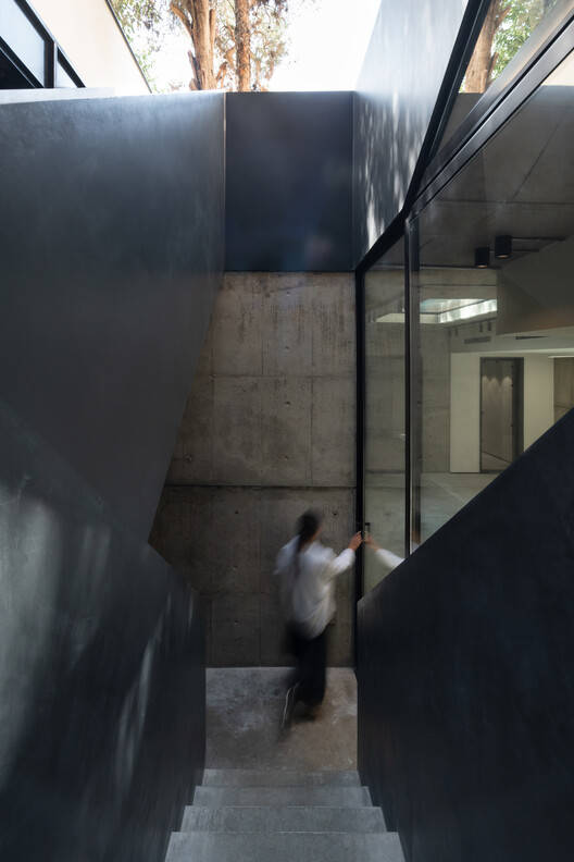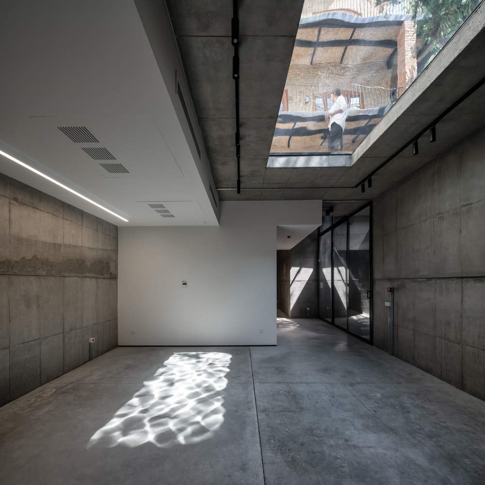 During the process of reinforcement, the main building was strengthened by methods such as the implementation of 13-meter-deep piles, a strip foundation, shotcrete walls, and metal mesh floors. Keeping the original shape of rooms and spaces on each floor and redesigning them to create shared meeting rooms, presentation areas, focus rooms, game rooms, and shared office booths. The courtyard was excavated creating a basement level to be used as a performance area and music room. The existing pond was then redesigned as a glass pond, emphasizing the visual connection between different layers of the project.