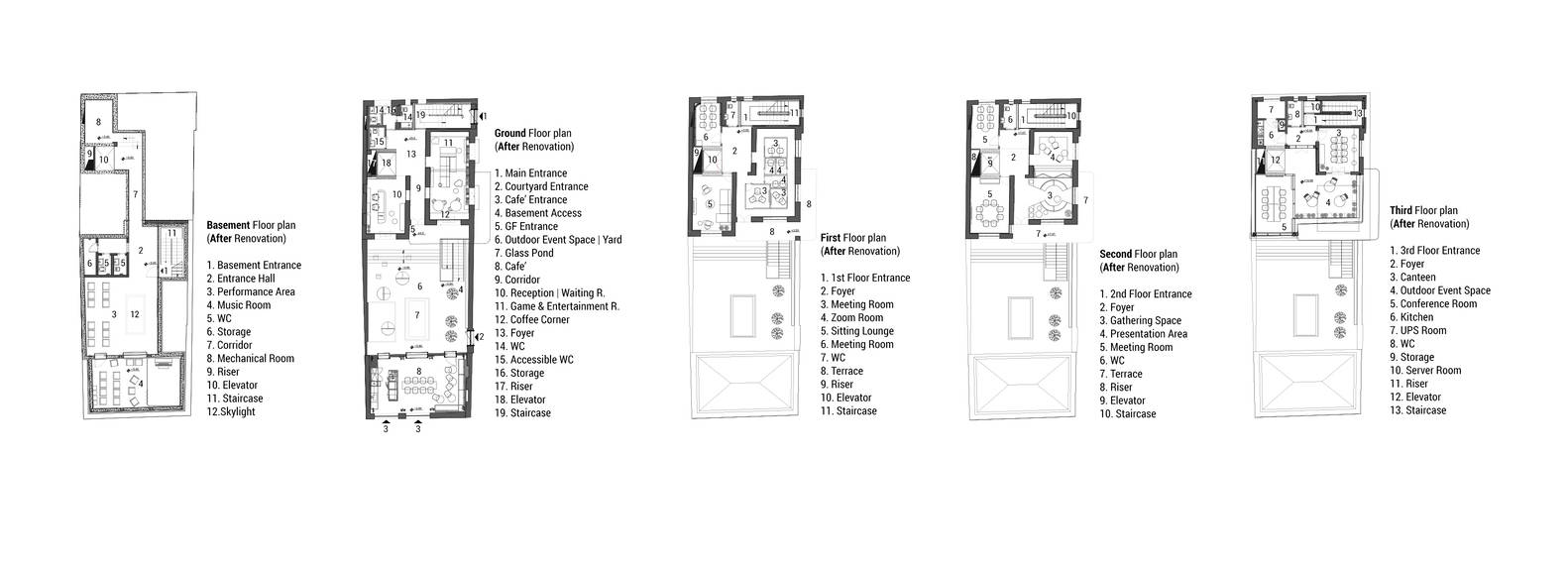 在加固过程中,主楼通过实施13米深的桩、条形基础、喷射混凝土墙和金属网地板等方法进行了加固。保持每层楼房间和空间的原始形状,并对其进行重新设计,以创建共享会议室、演示区、焦点室、游戏室和共享办公隔间。庭院被挖掘出来,形成了一个地下室,用作表演区和音乐室。然后,现有的池塘被重新设计为玻璃池塘,强调了项目不同层之间的视觉联系。