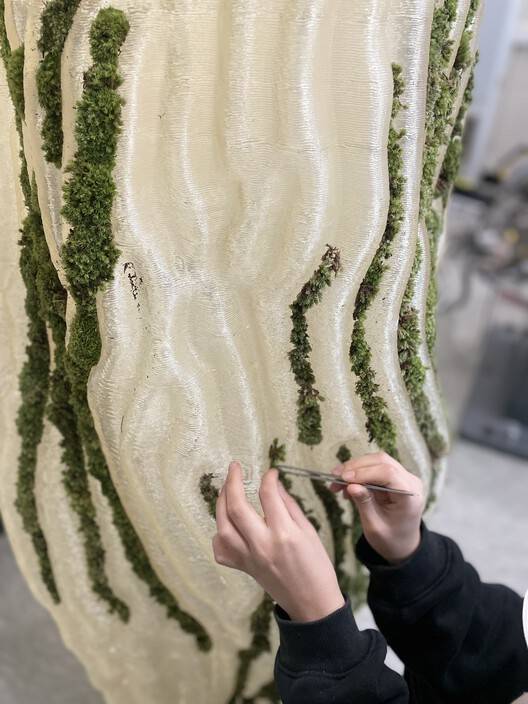 通过该模型得出的设计算法,生成了一个整体的垂直形状,前景(苔藓)在3000毫米的高度上与背景(3D打印结构)融为一体。为了实现有效的大规模3D打印,使用了熔融颗粒制造(FGF),挤出机在6轴机械臂(ABB IRB-4600)的末端运行,PLA颗粒的喷嘴尺寸为2毫米。这种垂直堆叠的制造过程成为一种设计约束,影响了定制工作流程的建立。