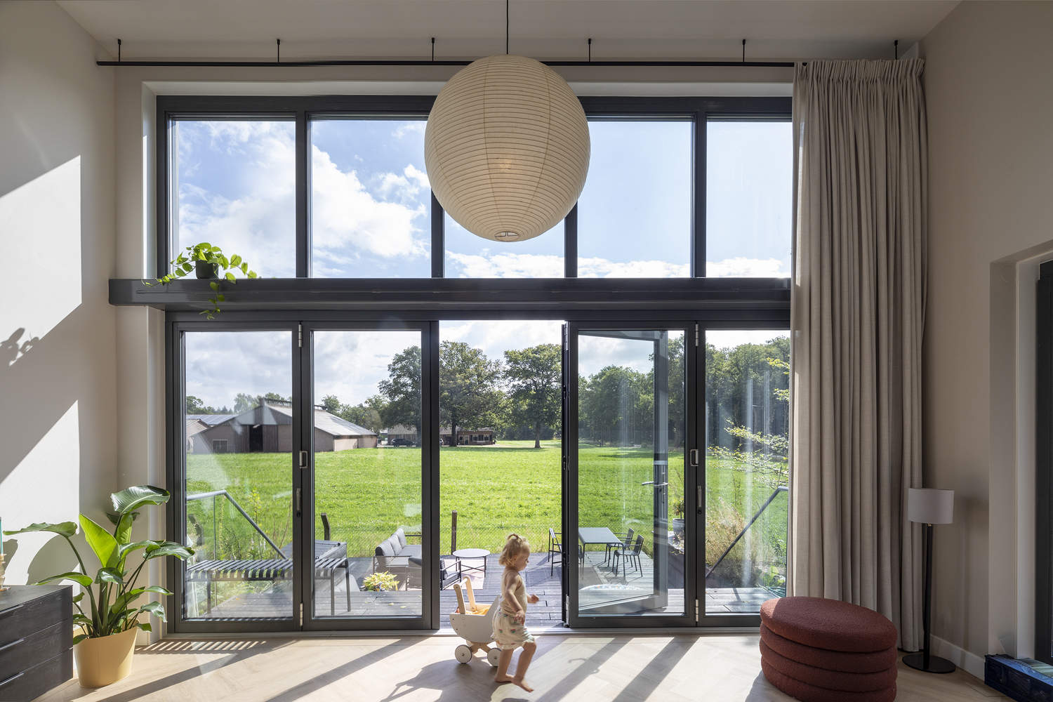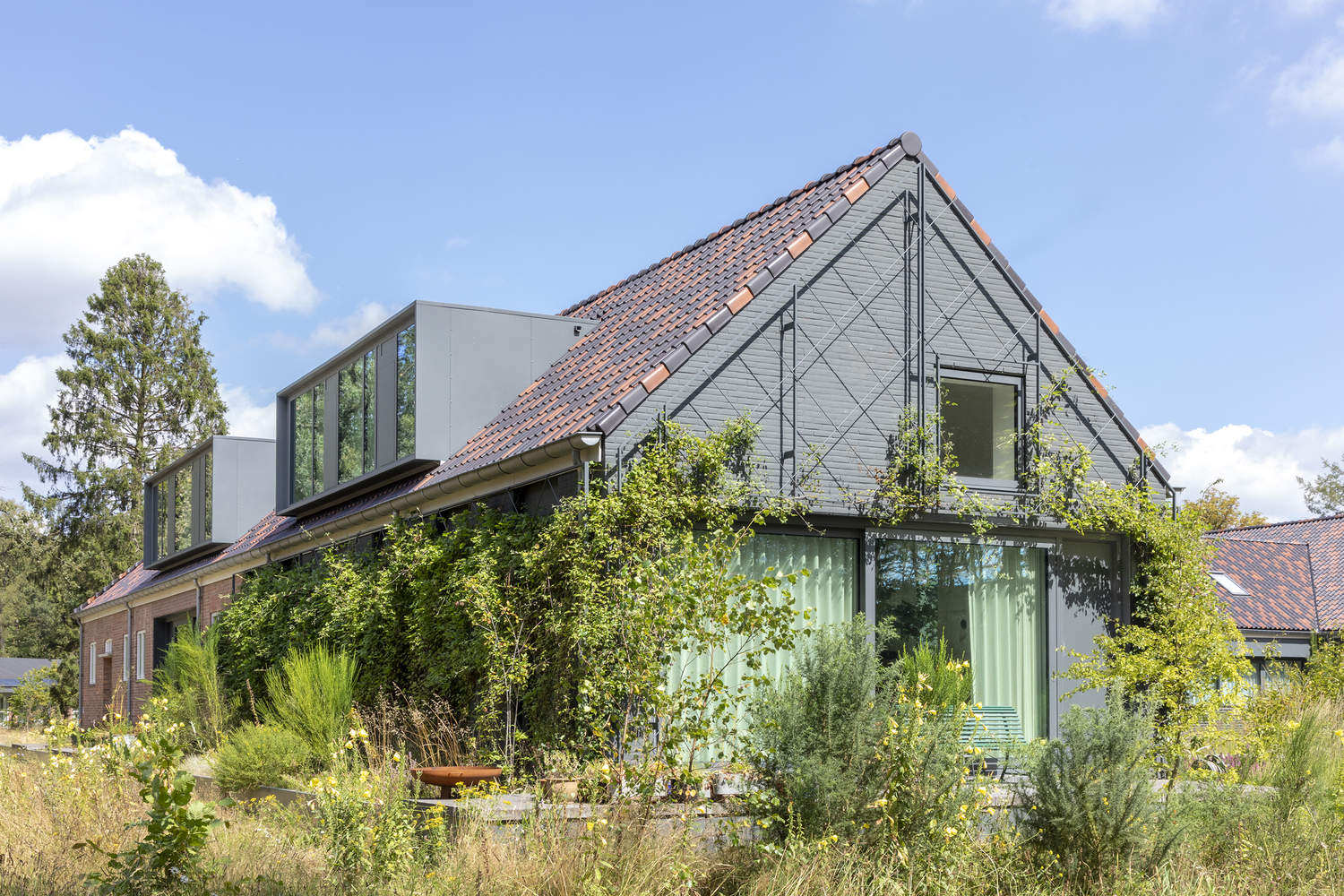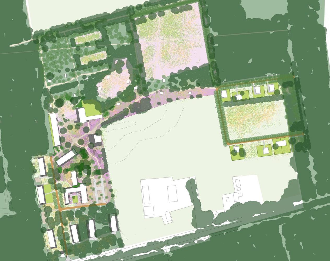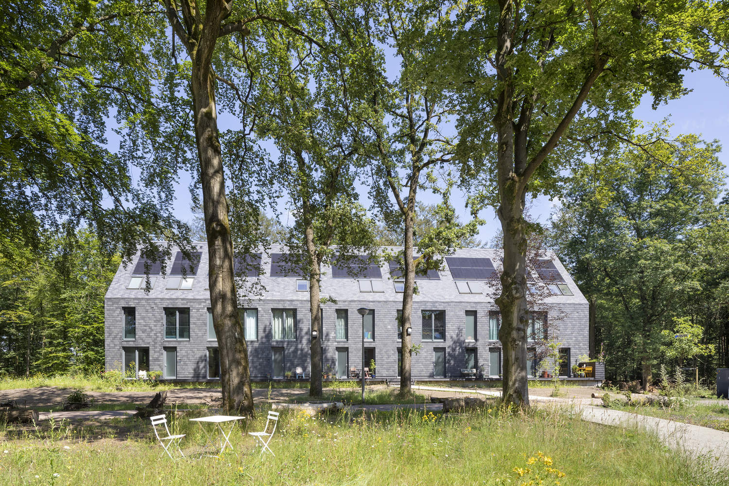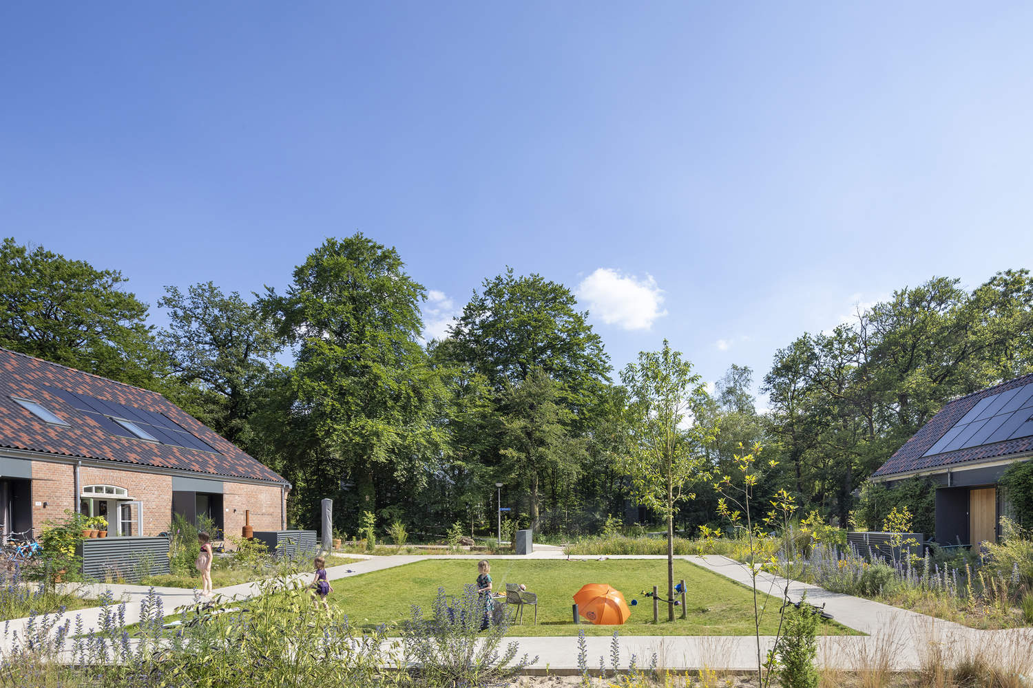The transformation began by "pulling the Veluwe landscape over the site like a blanket, much like how the barracks and airfield were camouflaged to blend seamlessly into the surroundings" says Harro de Jong of Buro Harro, one of the initiators of the Buitenplaats Koningsweg project. The landscape design uses minimal hard landscaping, with narrow footpaths allowing nature to flourish in between built elements, while the fences that once enclosed the site have been removed to allow wildlife to roam freely. "When we first started, the site was a desolate, heavily paved, and built-up area. Now, people live, work, and relax in a serene landscape that feels as if it has always been here."