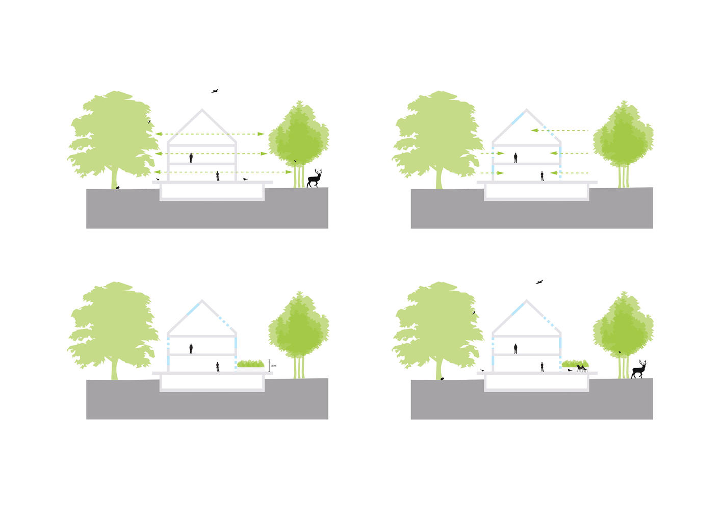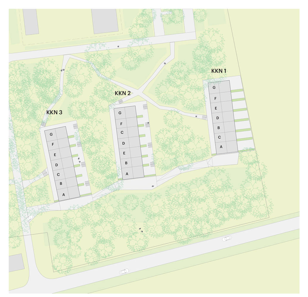 The future owners of these "townhouses in the forest" could choose their favorite floorplan, from a range of possibilities. The homes are raised above ground level, with outdoor spaces that are minimally enclosed: beyond their small projecting decks, they have no garden, but instead an intimate connection to the surrounding forests, with large shared spaces between the homes on both the front and back of the buildings.