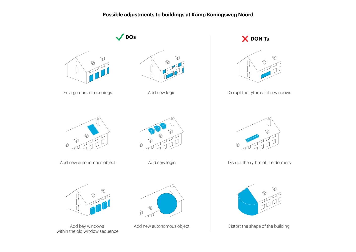 在20世纪后半叶,在所有剩余的建筑被添加到荷兰国家纪念碑名单之前,进行了许多改建。MVRDV和Buro Harro的总体规划与这段历史密切相关:根据国家古迹登记处制定的规则,现有的主要是砖砌建筑被保留(对于原始的德国建筑)或改造(对于后来的荷兰建筑),并进行了改造,如新的门和老虎窗,其深灰色饰面清晰可辨。与此同时,之前被拆除的建筑被复活为形状和大小相同的建筑,用浅灰色材料完成。