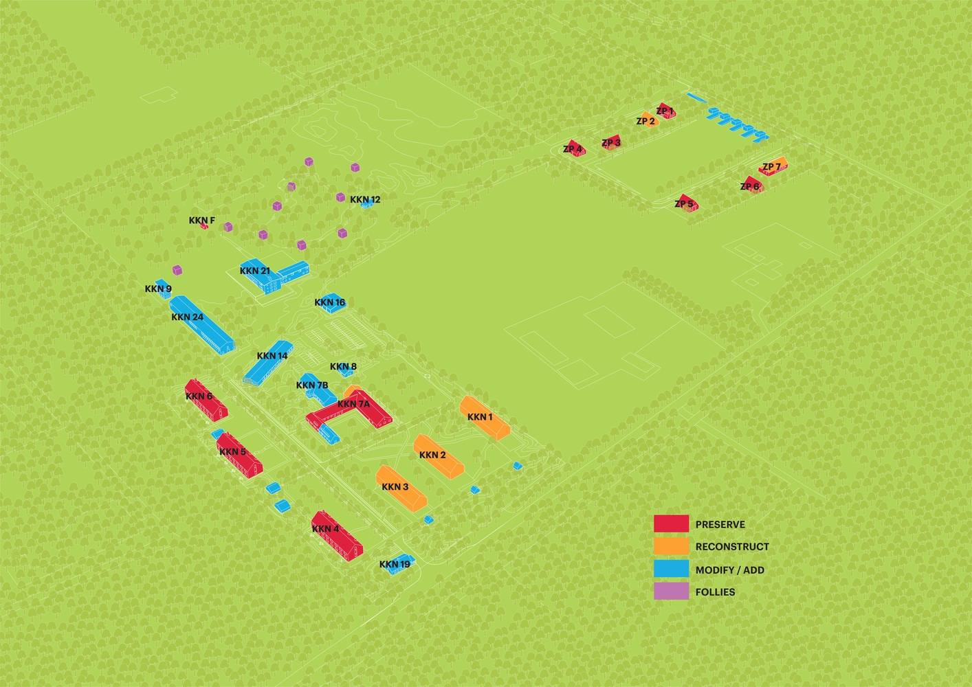 In the latter half of the 20th century, many alterations were made, before all the remaining structures were added to the Dutch list of national monuments. MVRDV and Buro Harro's masterplan engages carefully with this history: following the rules established by the national monuments register, the existing mostly brick buildings are preserved (in the case of the original German constructions) or transformed (in the case of later Dutch constructions) with alterations such as new doorways and dormer windows made clearly identifiable by their dark grey finishes. Meanwhile, previously demolished buildings are resurrected as buildings of the same shape and size, completed in light grey materials.