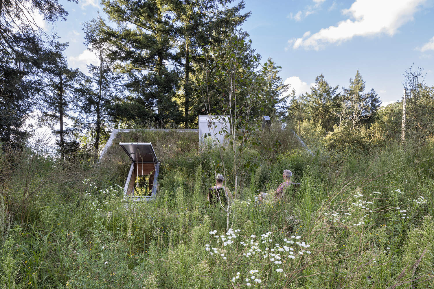 Koningsweg的Buitenplats最初是两个设施,Kamp Koningsweg-Noord和Zeven Provinciën。这些飞机建在迪伦机场的轨道上,迪伦机场在第二次世界大战期间是荷兰最大的德国机场。混凝土军事掩体伪装成农舍,试图掩盖其军事目的,使其融入周围的自然环境。这些自然环境增添了另一层意义:该项目位于荷兰最重要的自然区之一Veluwe的森林中,也是该国最大的陆地Natura 2000指定区。