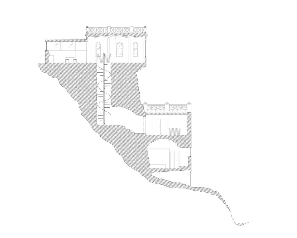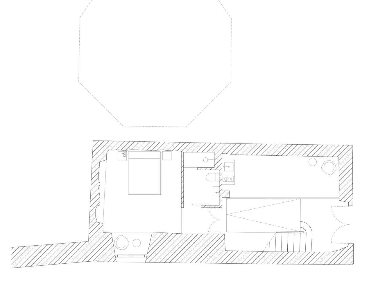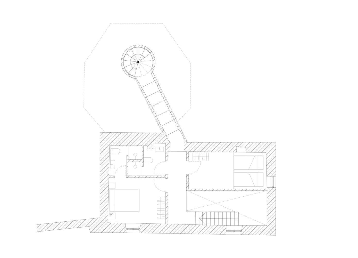沿着曾经用于水流的旧水渠,挖掘了一条垂直隧道和一个小的水平段,以连接所有建筑物。在这条隧道内,我们安装了一个大型螺旋楼梯,现在将整个建筑连接起来,可以直接进入塔楼。这创建了一个流畅且相互连接的布局: