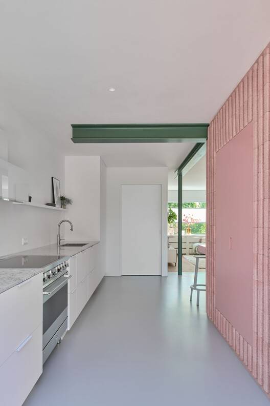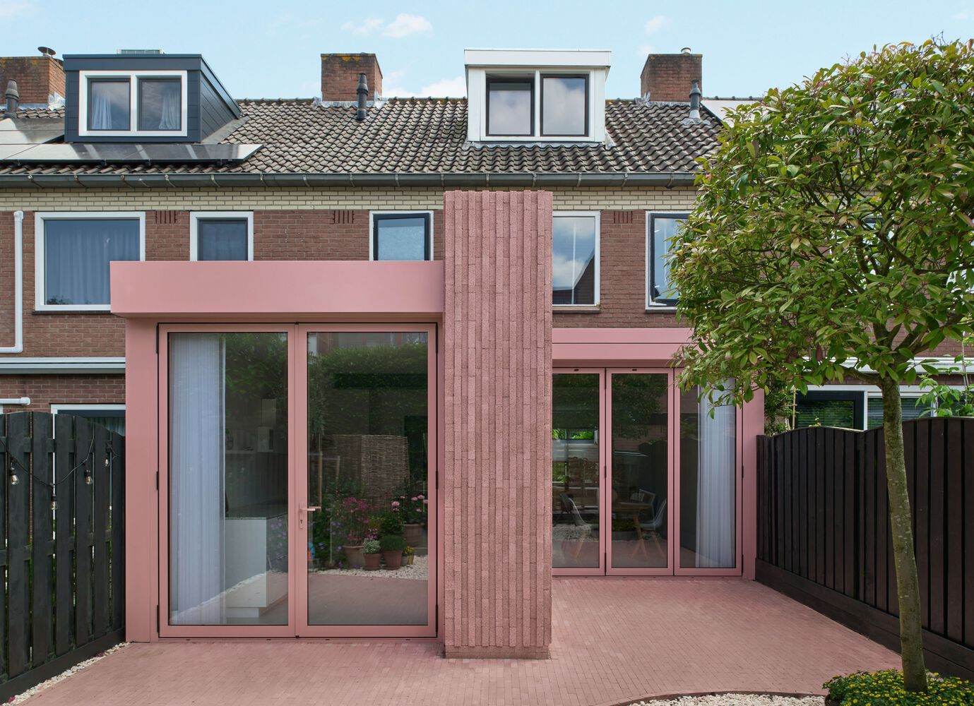Text description provided by the architects. Rosa is a thoughtful renovation and ground-floor extension of a 1960s rowhouse in Bussum, The Netherlands. Designed by Atlas Architects, the project integrates contemporary architectural elements while respecting the character of the original brown brick structure. A warm pink palette, used consistently throughout the exterior and garden, defines the visual identity of the project and inspires its name, "Rosa." At the heart of the extension is a large, striking pink concrete masonry block that serves not only as an aesthetic focal point but also as a multifunctional object. The block integrates practical elements such as cabinetry and an outdoor fireplace, creating a seamless blend of form and function. The concrete bricks are arranged in a vertical pattern that further enhances the modern yet cohesive feel, ensuring harmony with the existing building.