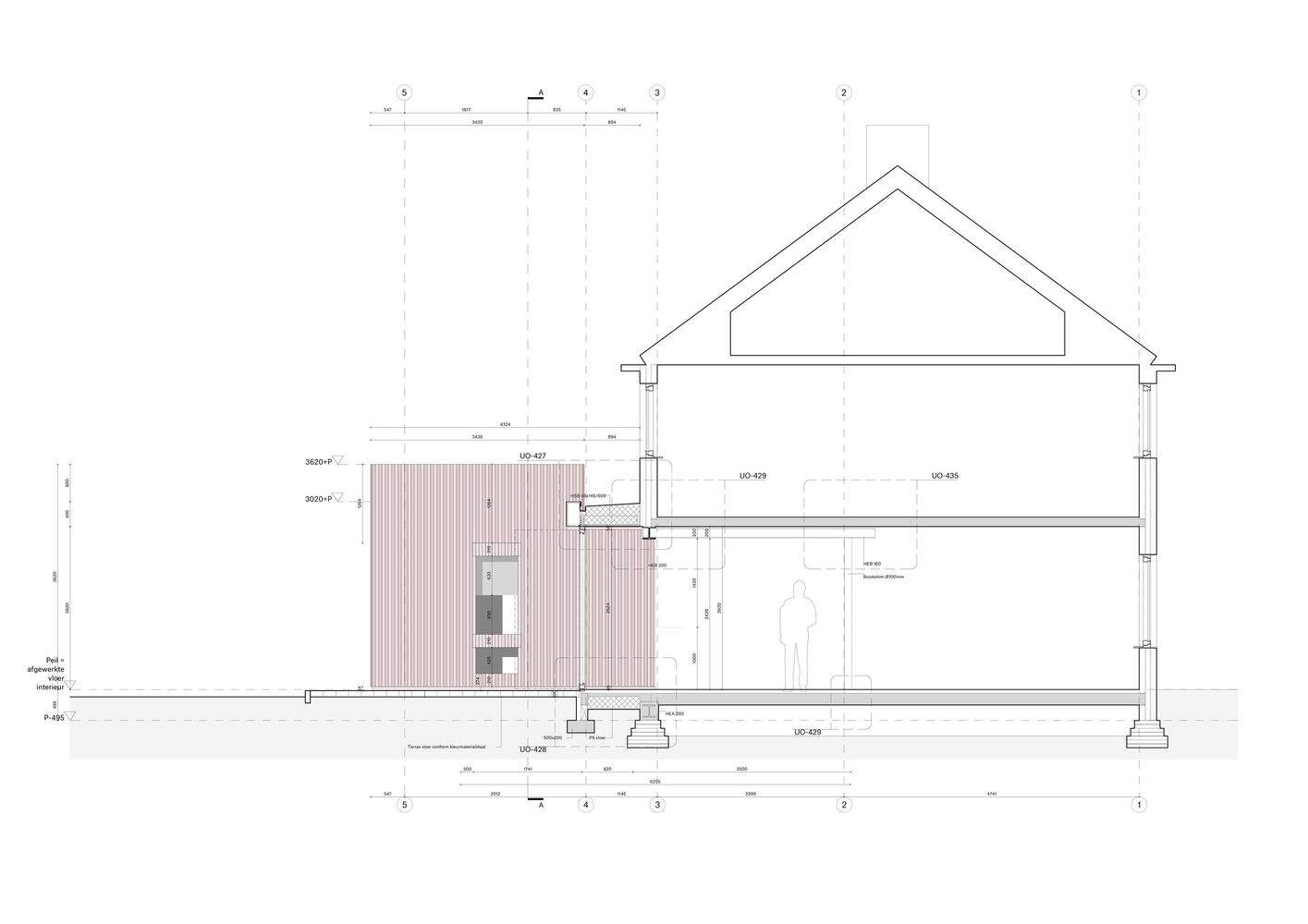 The extension enlarges the kitchen and dining area, while simultaneously crafting new outdoor spaces that prioritize openness and connection to the garden. The terrace, finished with matching pink bricks, ties the house and garden together, while aluminum window frames, matched to the same hue, maintain a refined continuity throughout. By opening the big folding doors, the line between the inside and outside is blurred as the concrete block continues uninterrupted. A hidden sunscreen, cleverly tucked behind the aluminum frame, adds functional elegance to the design, providing shade and comfort without detracting from the minimalist aesthetic. The entire project was completed with great attention to detail, including the meticulous installation of the vertically glued concrete bricks, bringing together both craftsmanship and innovation.