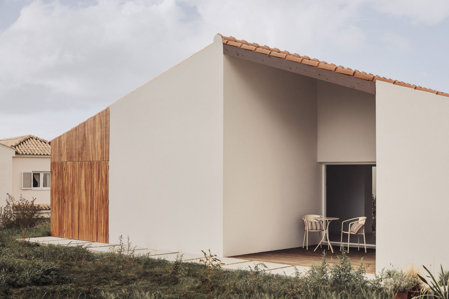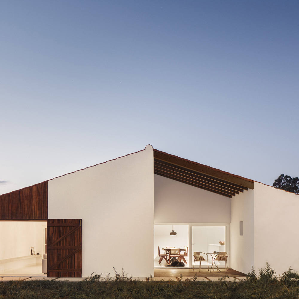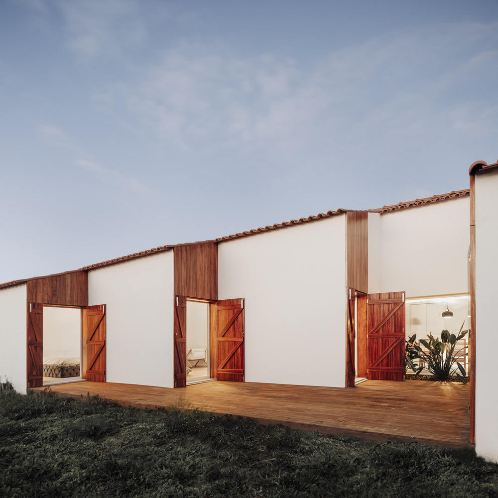 The owner's wishes were clear: to replace the original house where he grew up with a similar one, strategically placed to avoid direct exposure to those neighbors. The design proposal was a simple building with a pitched roof that follows the longitudinal shape of the lot and the village identity. Programmatically, the project is divided into two clear groups. On the east side are the supporting spaces – bathrooms, closets, circulation, and kitchen – and the facades are composed of small openings to ensure some privacy and better acoustic control from the access road. To the west side, the main spaces – living room, office, and bedrooms – gradually open out onto the garden through large windows which are covered with exterior wooden shutters.