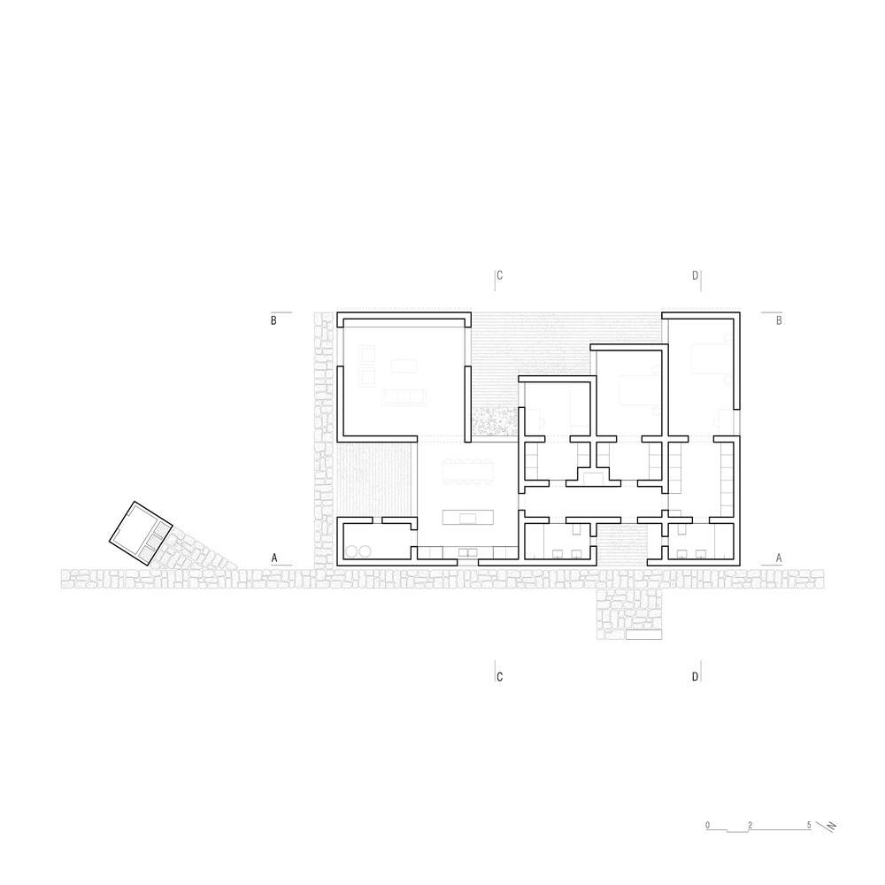 The materials and construction solutions of the project are respectful of local tradition, highlighting strong assonance with the village's original buildings through the whitewashed walls and the pitch of the tiled roof that harks back to well-known images of Mediterranean villages. On the floor inside, the handmade cement tiles emphasize the house's rural character while in the bedrooms the warmth of the wooden floors exploits the natural light strategically, distinguishing what is private and what is common to everyday life. In between the street and the new house, a "stone line" is developed to unify the whole complex and to connect the parking area to a vertical technical volume. This small addition, which is a clear allusion to the original oven house, plays a complementary role in the whole complex and contains the outdoor kitchen with its barbecue, all the technical equipment, and garden storage.