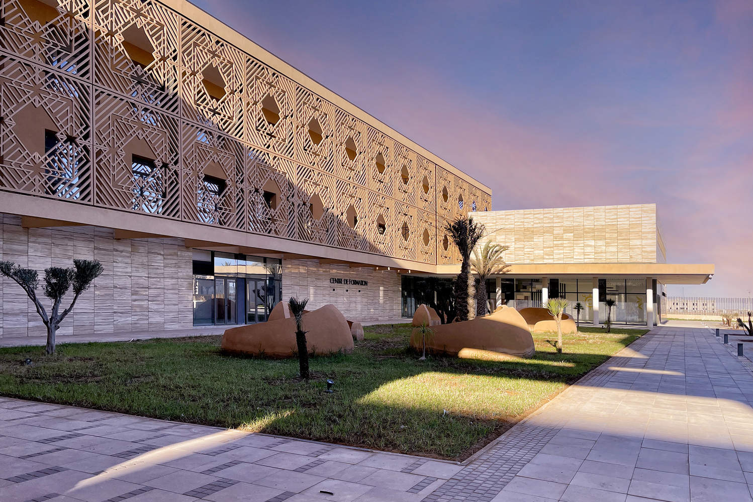 Text description provided by the architects. Our ambition is to create an iconic building imbued with authenticity, an architecture that evokes our heritage. The local context is highlighted to establish a strong identity while adding a distinctly contemporary touch, reflective of our time.As a nod to traditional architecture, we have used local materials such as Travertine marble-volubilis, crowned with geometric patterns inspired by Moroccan heritage, as well as perforated panels reminiscent of "moucharabiehs." The traditional motifs of these panels adorn the façades of the project, giving it an identity inspired by southern Morocco.