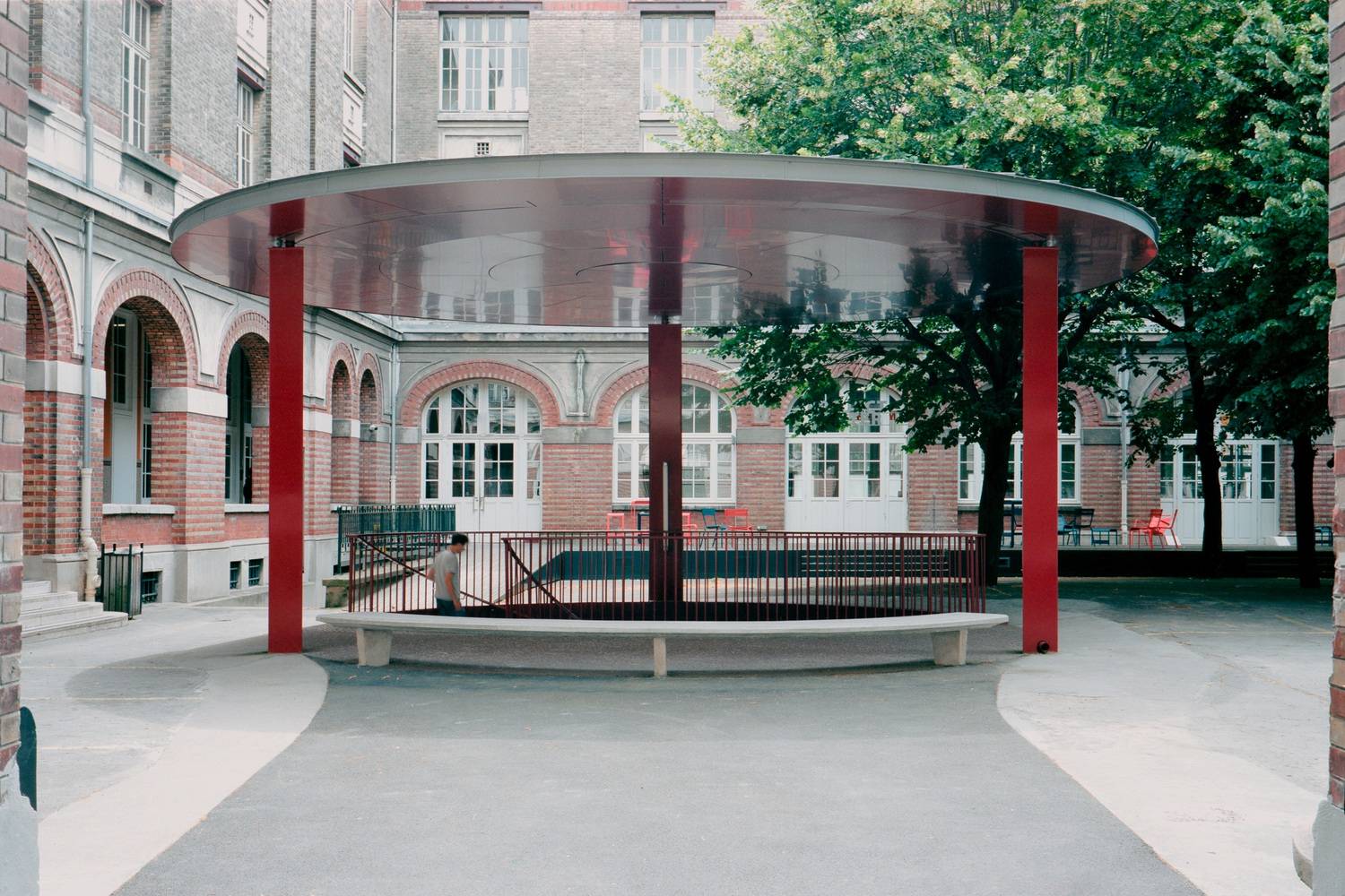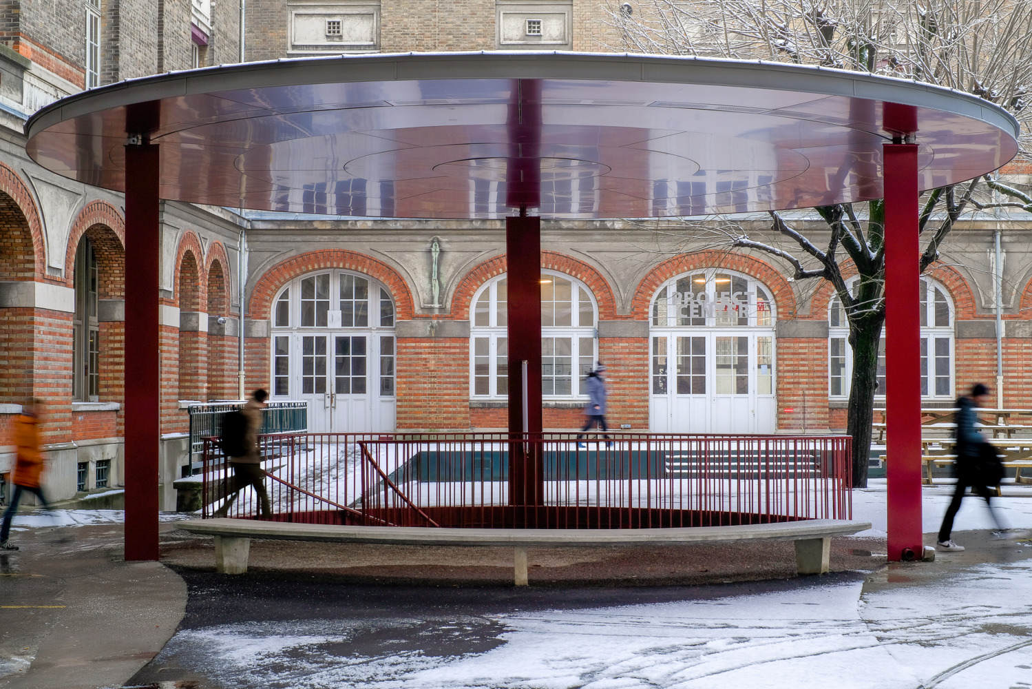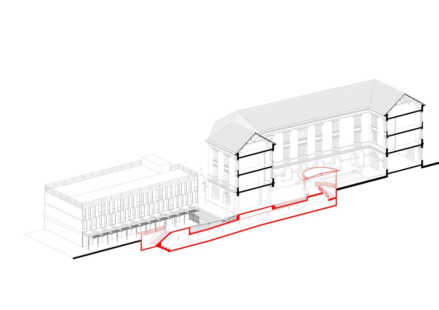 As a central element of the project, the underground link, passing under the historic building and the street, must be more than a simple functional link. Its extremities are materialized on the surface by two canopies, one newly created in the historic courtyard, the other redesigned in front of the auditorium. Going beyond its function as a link, it becomes a new space appropriated by campus users. A link and a place for the school. On the historic side, the new canopy is positioned in the right center of the courtyard, acting as a signpost. It houses the spiral staircase that descends in a fluid movement to the gallery. Like an abstract disc floating in the historic courtyard, the new canopy provides a shelter for the school. On the other side of the crossing, the gallery emerges in a simpler geometry, with a set of staircases developing in continuity with the contemporary architecture of the auditorium.