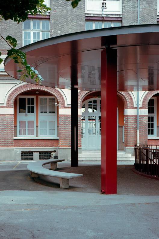 历史与现代的融合:该项目巧妙地将 19 世纪的历史建筑与 2009 年的现代风格扩建部分相连。地下连接不仅仅是功能的实现,更成为校园用户的新空间。新的天棚在历史庭院中如抽象圆盘,为学校提供庇护,与礼堂前的现代几何形状相得益彰。红色污渍的钢筋混凝土结构既呼应历史建筑的装饰性砖砌,又展现出基础设施工程的施工过程,实现了历史与现代的完美融合。