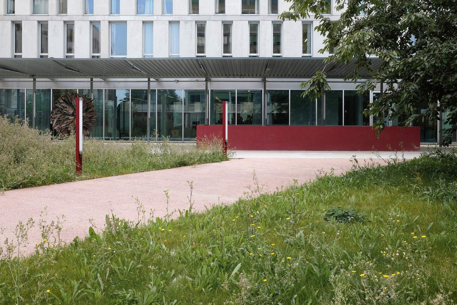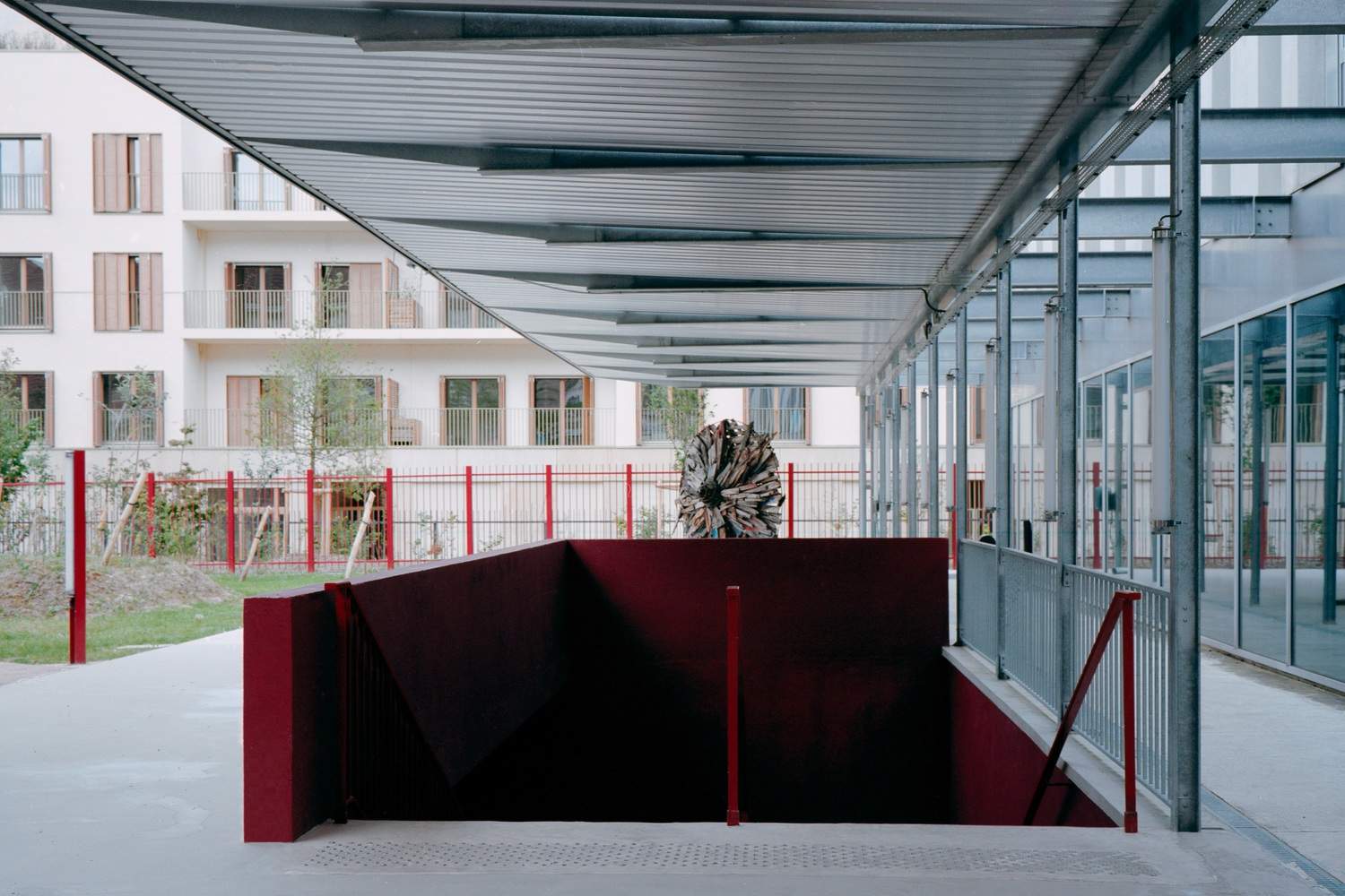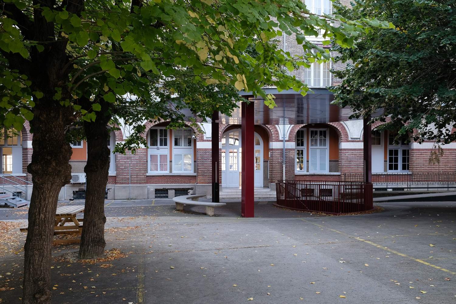 To the south, the link leads into the historic Isae-Supmeca building, the former premises of the Ecole Nationale Professionnelle de Commerce et d'Industrie de Saint-Ouen. This classically designed 19th-century building is characterized by its symmetrical composition, regular construction, and ordered facades. To the north, the link connects with the school extension (housing the school's auditorium) built in 2009 in a resolutely contemporary style. From an urban point of view, the new gallery is intended to bridge the gap between Saint-Ouen's historic past and the urban renewal associated with the creation of the Athletes' Village.