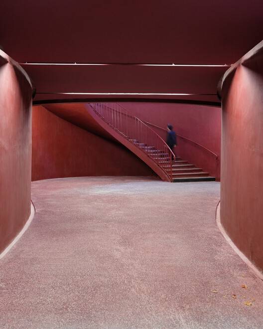 Necessarily made of reinforced concrete, the structure's infrastructure is coated with a red stain that recalls the ornamental brickwork of the historic building, while revealing the material's appearance. The materiality of the shotcrete, left untreated, reveals the construction process of this infrastructural work. The treatment of the interior floors, staircases, and gallery follows the same logic, with the use of red porphyry aggregates providing visual continuity with the stained concrete walls.