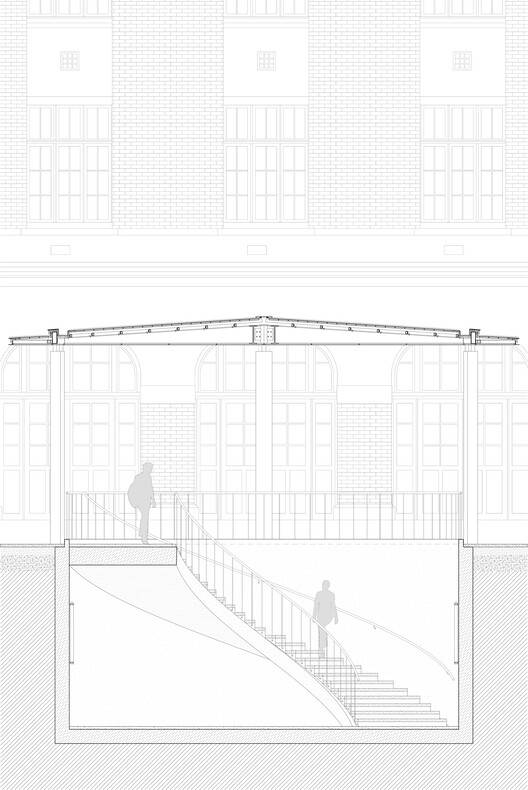 作为该项目的核心要素,穿过历史建筑和街道的地下连接必须不仅仅是一个简单的功能连接。它的末端在表面上由两个檐篷具体化,一个是在历史悠久的庭院中新创建的,另一个是重新设计的在礼堂前。它超越了链接的功能,成为校园用户占用的新空间。学校的链接和位置。在历史方面,新的天棚位于庭院的右中心,充当路标。它有一个螺旋楼梯,以流畅的运动下降到画廊。就像一个漂浮在历史庭院中的抽象圆盘,新的天棚为学校提供了一个庇护所。在十字路口的另一边,画廊以更简单的几何形状出现,一组楼梯与礼堂的当代建筑连续发展。