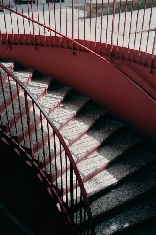 该结构的基础设施必须由钢筋混凝土制成,并涂上了一层红色污渍,让人想起这座历史建筑的装饰性砖砌,同时露出了材料的外观。未经处理的喷射混凝土的实质性揭示了这项基础设施工程的施工过程。内部地板、楼梯和走廊的处理遵循相同的逻辑,使用红色斑岩骨料与染色混凝土墙在视觉上保持连续性。