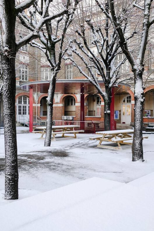 Text description provided by the architects. Located in Saint-Ouen in the northern suburbs of Paris, the site of the Isae-Supmeca Engineering School saw its spatial organization significantly impacted as part of the urban redevelopment project for the Olympic and Paralympic Games. This involved cutting a street through the campus to create the road network for the new Athletes' Village district. The project aims to reconnect the two parts of the school and restore its functional continuity by creating a new link between the two buildings, passing under the new road.