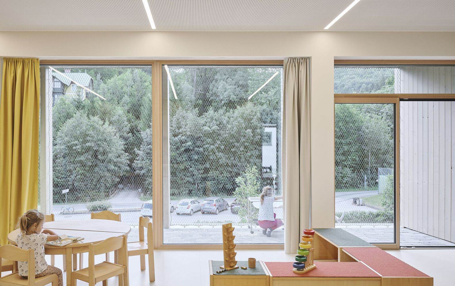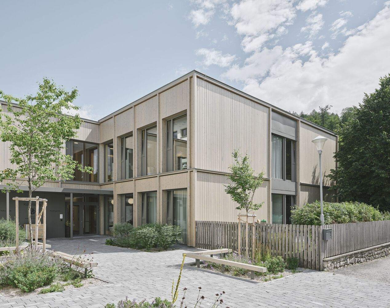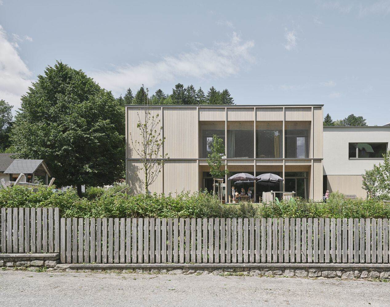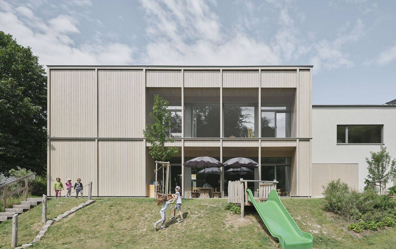 The new building features a structured wooden façade, hinting at the light-filled, spacious interiors. One of the two groups is situated on the upper floor, offering a distinct perspective. Despite lacking direct garden access, the upper group benefits from its own outdoor space and a balcony that provides stunning views, ensuring no compromise in quality or experience.