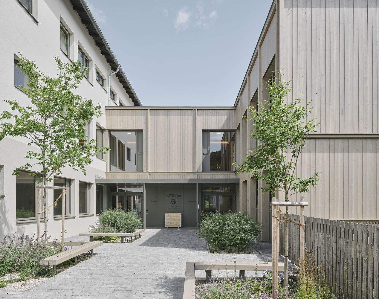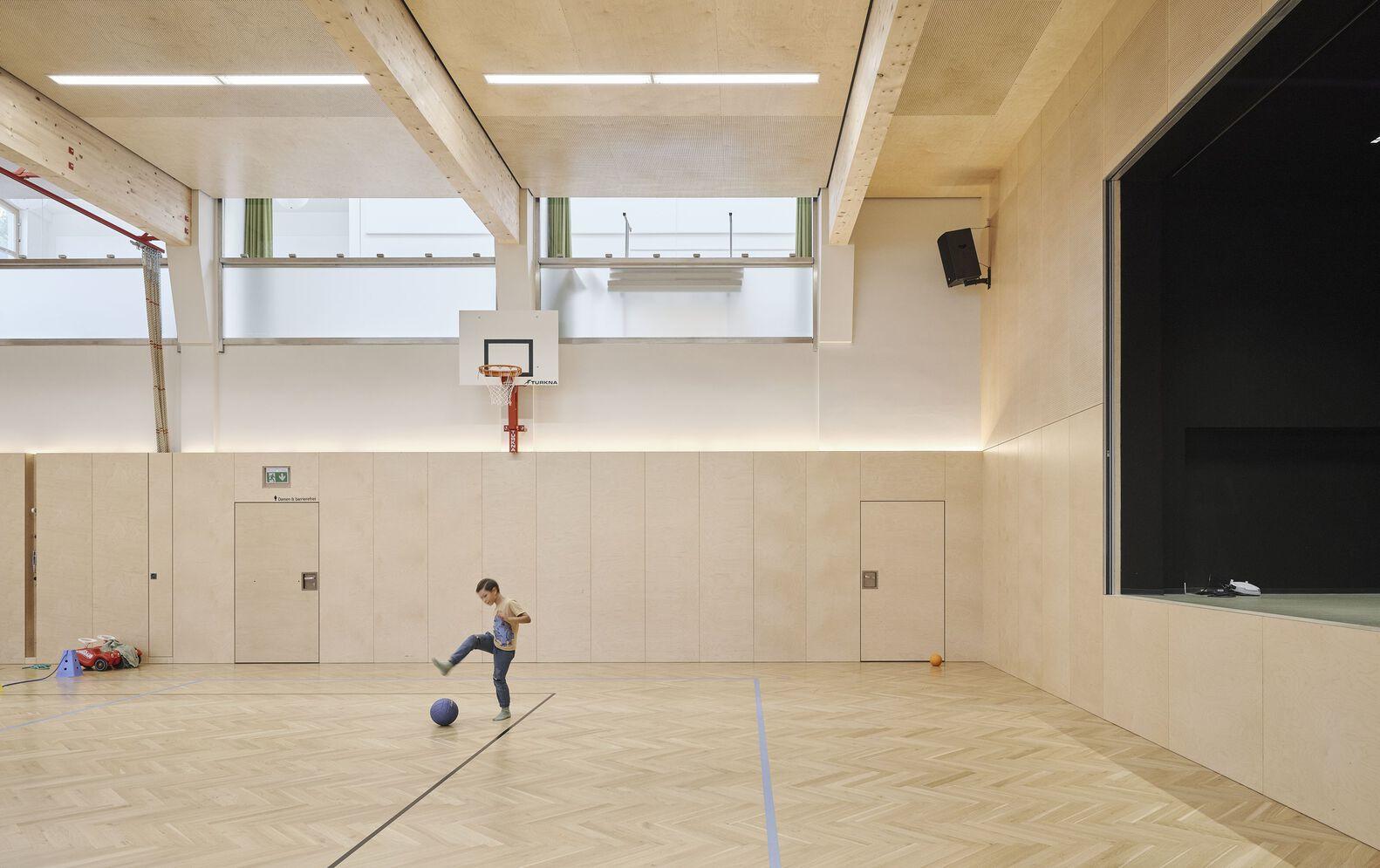 Text description provided by the architects. The design of the newly built kindergarten and the renovated gymnasium of the Kaumberg Elementary School balances functionality and a sense of playfulness, creating spaces that inspire both learning and connection.