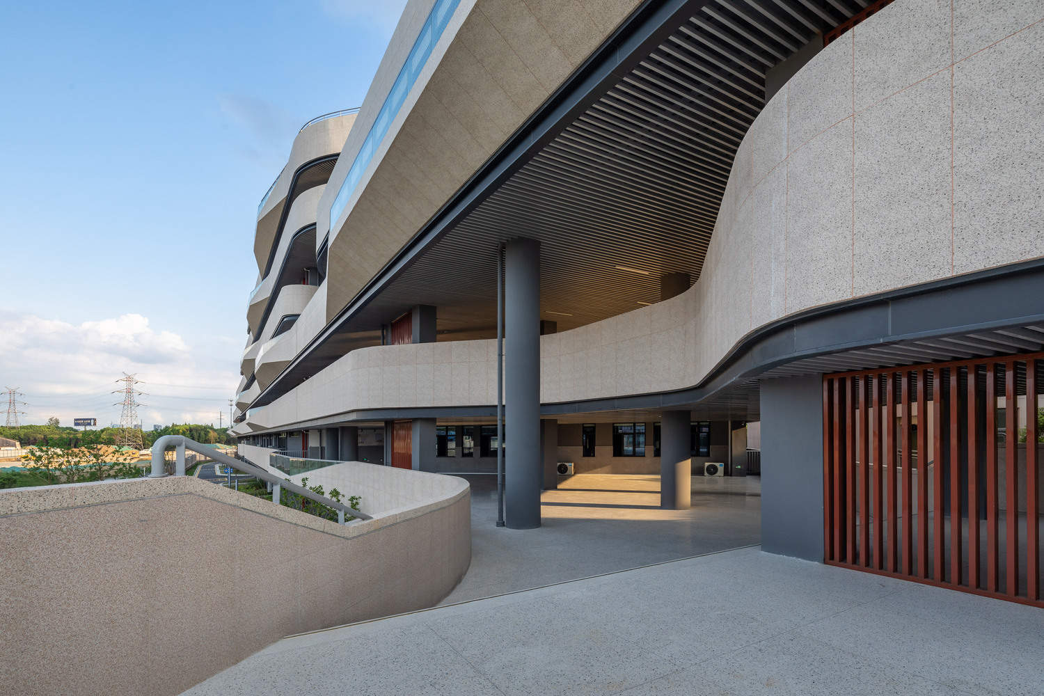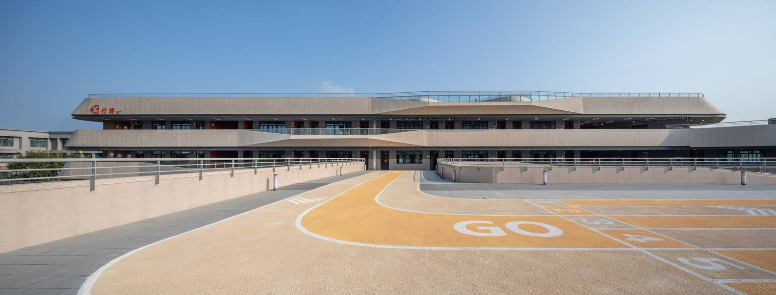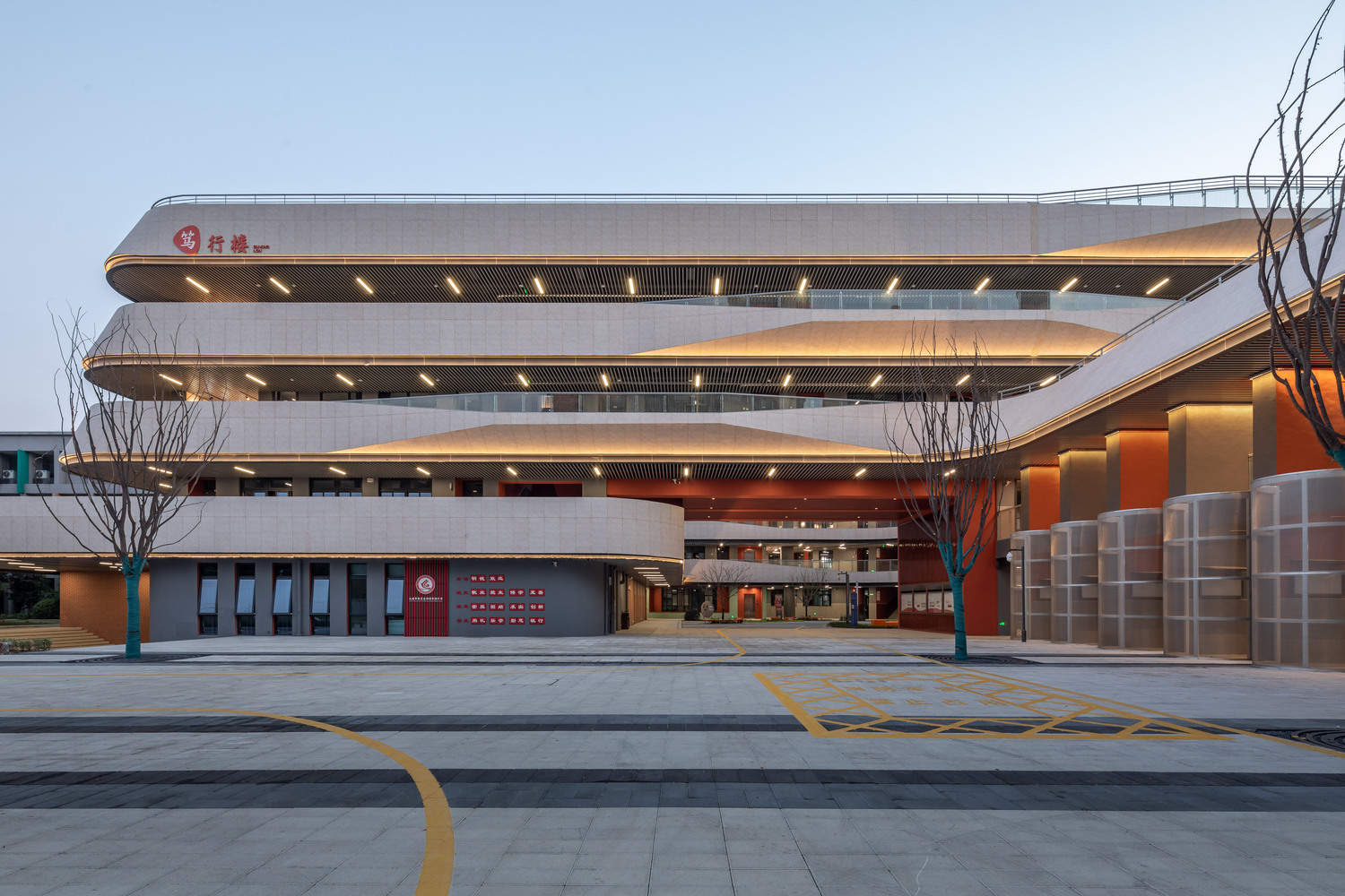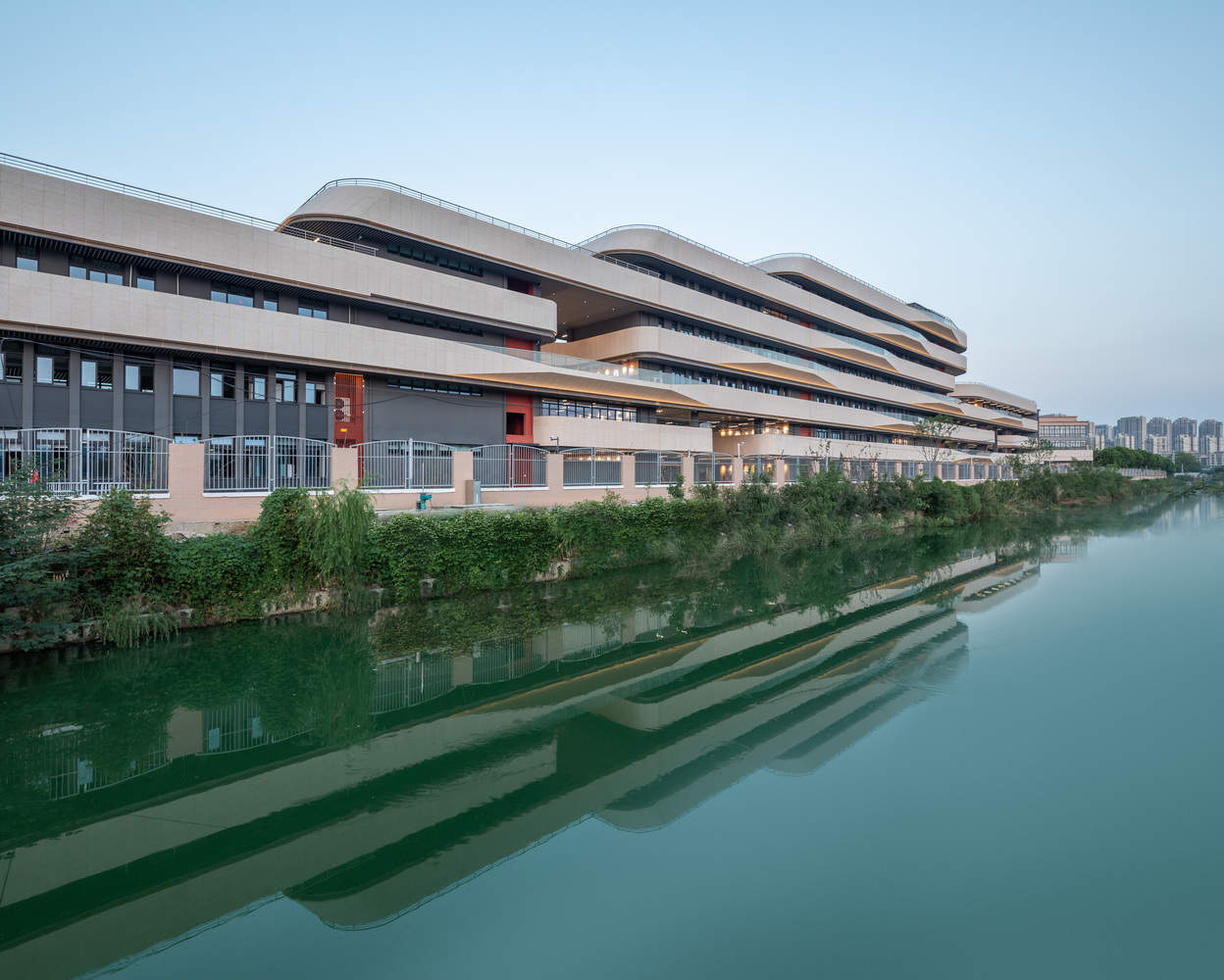 Façade - After the completion of architectural volume and space, there is not much left to do with the façade, which is actually enough by pulling through the horizontal railing on each level. However, from the conventional "design" perspective, the "façade design" is a mandatory action that cannot be bypassed, which costs us a second thought. Since there is a river on the east side, we made some changes called "water ripples" to the façade, which is actually a continuation of the façade practice of the Yongjiang Experimental School many years ago, but with some upgrades to make it look like more three-dimensional sense. When the lightings are turned up at night, the façade looks really sparkling up. Standing on the 312 national highway and looking from the east side, with the reflection of the façade in the water, the building looks like a big ship sailing on the sea. Unintentionally, the building itself has become another interpretation of "there is no royal road to learning".