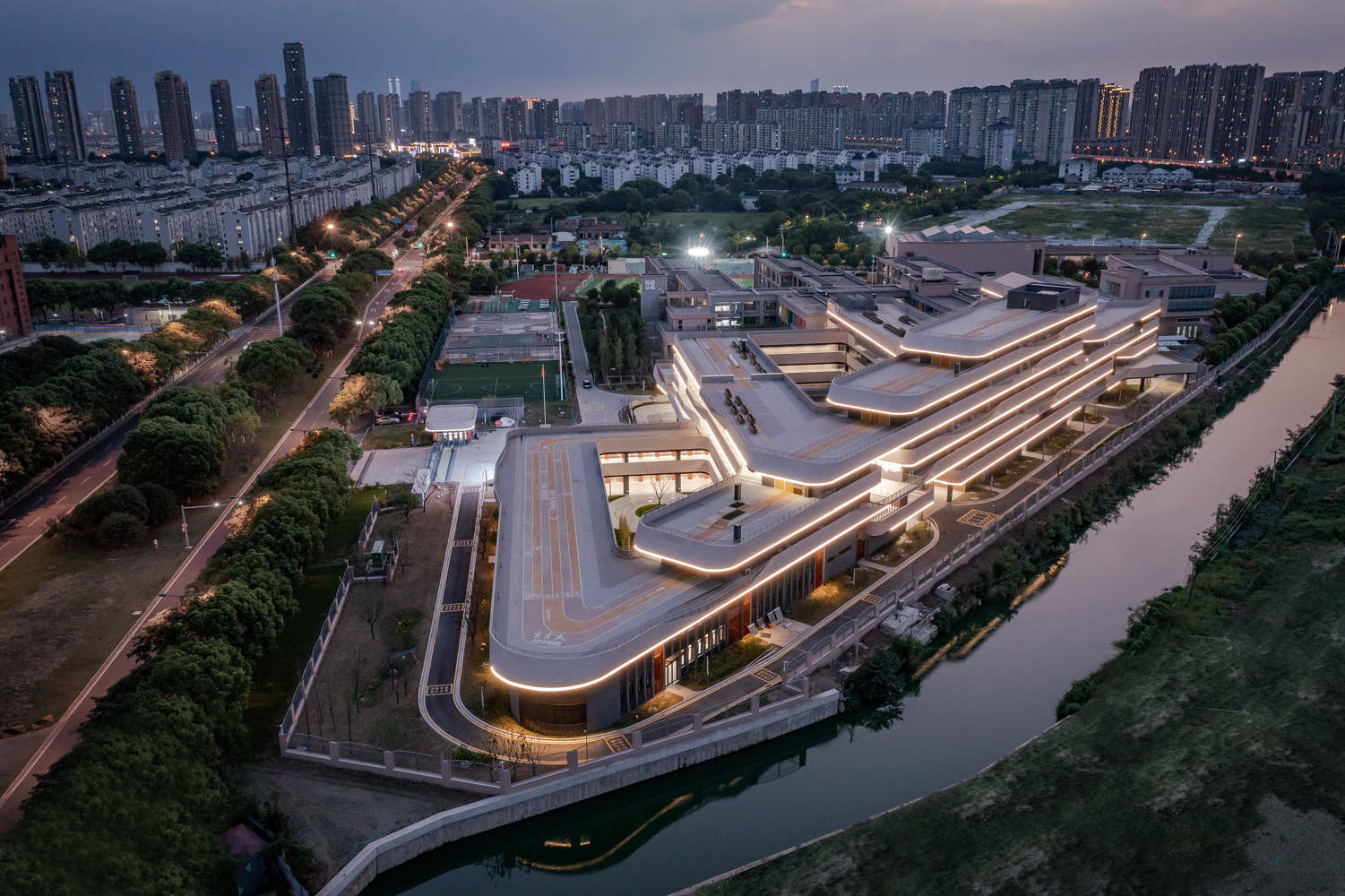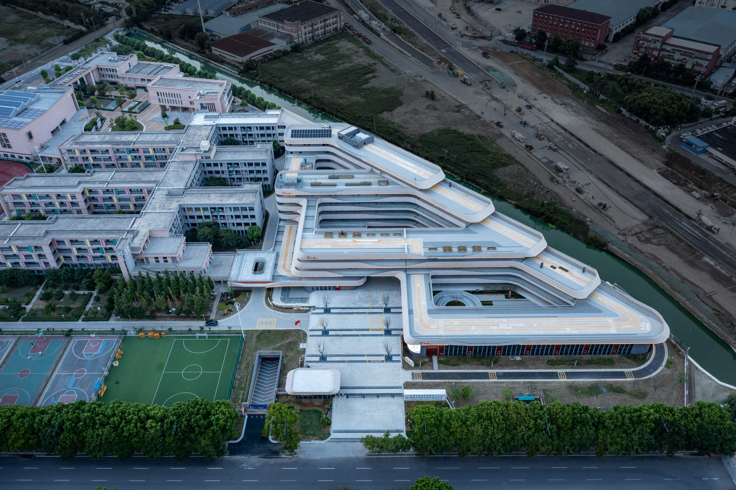 Text description provided by the architects. Xinfang Experimental Middle School is located on Xinguang Road in Xinwu District, Wuxi, with Chunyang Experimental Primary School on the west and the river on the east. The conceptual design of this project was completed during Shanghai's lockdown period in 2022, and after two years' of deepening design and construction, this project was successfully opened in September of this year.