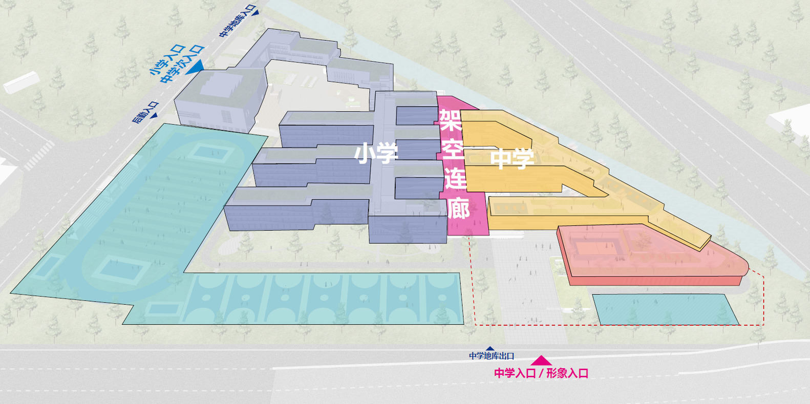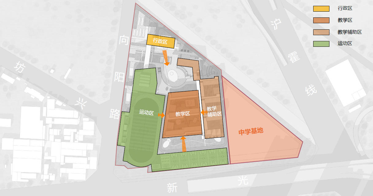 该项目占地面积约15000平方米,需要提供30个班级,地上建筑面积17000平方米。毫无疑问,这不可避免地会导致高建筑面积比和高密度。同时,场地的三角形形状给建筑布局带来了更大的困难和挑战。此外,该项目最初是将现有的春阳小学扩建为初中。然而,该项目建成后,转为独立运营和使用。因此,整个设计遵循了扩张和重塑的逻辑。