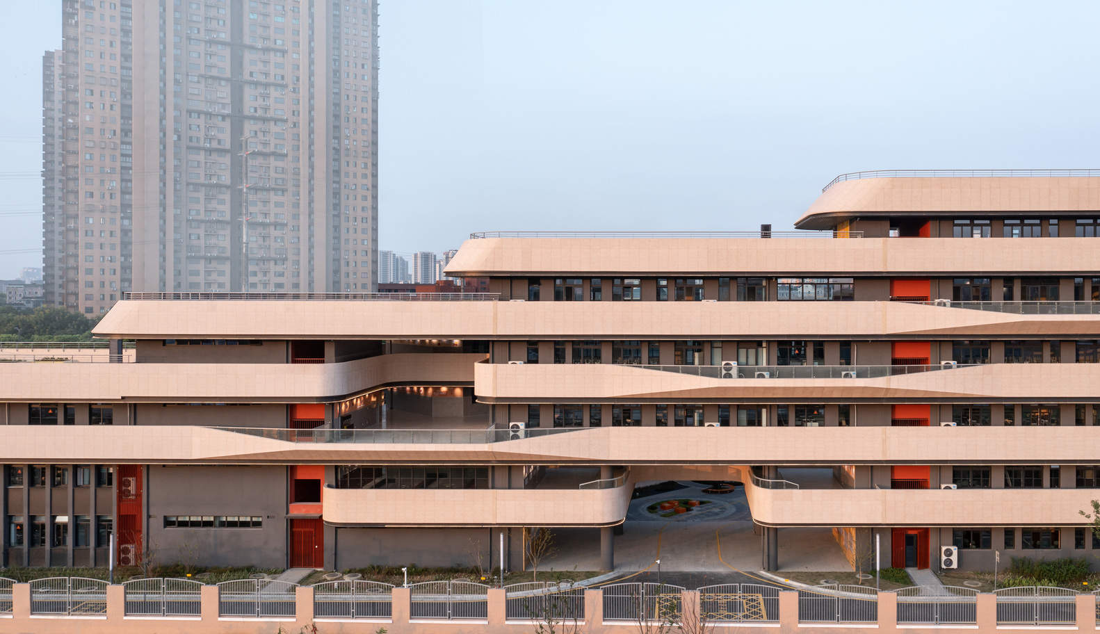Richer and more vivid architectural forms - There is no doubt about the advantage of the setback in shaping the volume of the building. In this case, within the extremely limited site area, the stepping back strategy not only solves the problems such as functions, sunlight, ventilation, outdoor space, architectural scale, etc., but also forms a rich and vivid architectural form, layer by layer, like a mountain. This form is completely deduced from the functional demand: pushing in where there needs to be an entrance plaza, pulling out where there needs to be connected to the existing primary school, which forms a kind of logical rather than decorative aesthetic experience. Eventually, the newly built part presents a completely different sense of view from different positions, angles, and heights.