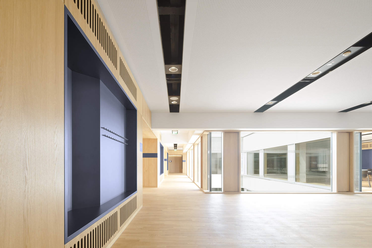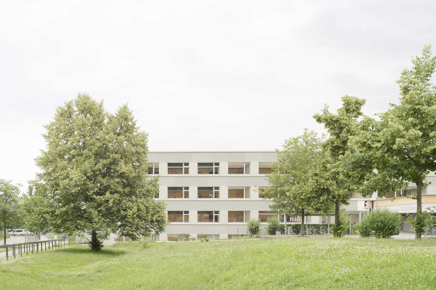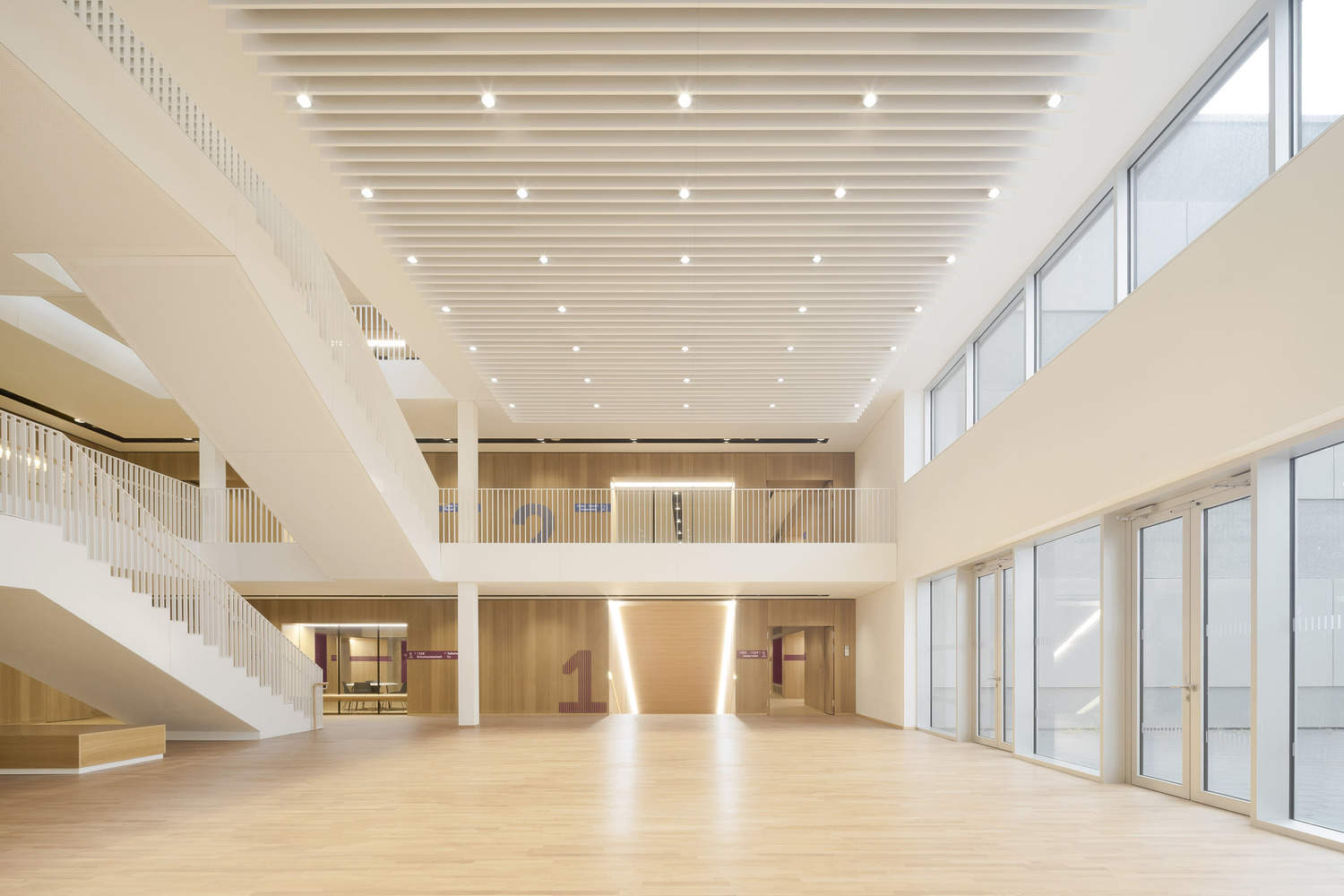 The facade, characterized by large window openings, is horizontally articulated by alternating bands of smooth precast concrete and rough stucco, which is given a special charm by the subtle relief of the surfaces. The three-story auditorium, flooded with daylight, connects the learning houses to the specialized classrooms via galleries, creating attractive visual connections between the levels. Thanks to the sloping terrain, two of the auditorium's three levels offer connections to the surrounding outdoor spaces.