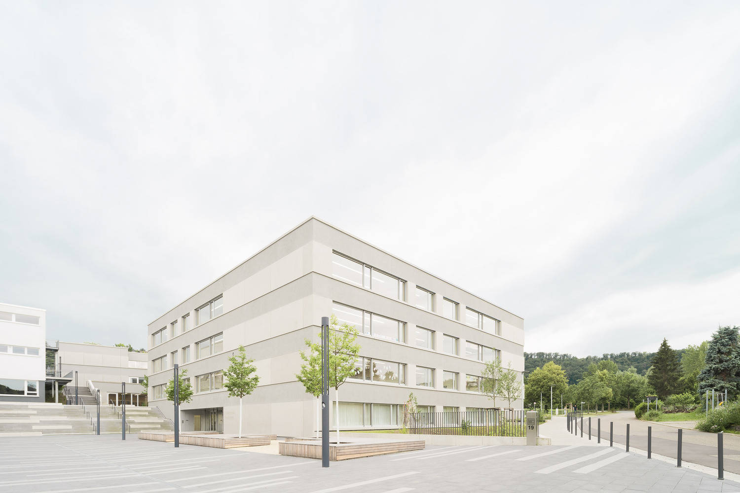 建筑师提供的文字描述Text description provided by the architects. At the request of the town of Gerlingen, the secondary school built in the 1970s has been expanded to accommodate three classes per grade and adapted to current educational standards. The design defines the mid-level secondary school as a recognizable place of distinct identity within the existing school complex. The existing building remains as a shell and is transformed through modifications and additions into the central element of a modern school ensemble with flexible use potential.