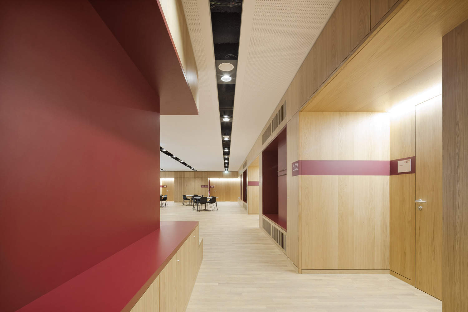 The new construction, with its modern, specialized classrooms, is arranged in a ring around the existing building, transforming it into a »learning house« with cluster areas and featuring an essential element of the pedagogical concept: flexible spaces that provide places for quiet or group work and can also be used by students to simply gather and hang out. Six classrooms per floor are grouped around each cluster.