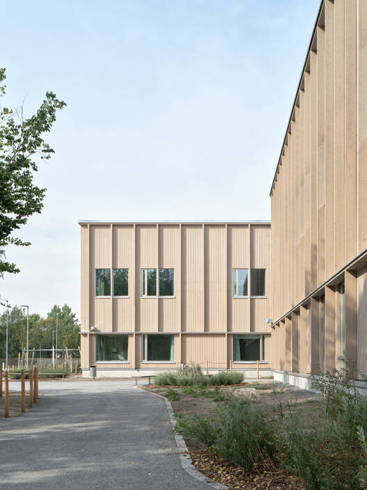 建筑师提供的文字描述Text description provided by the architects. Helsinki's new primary school and kindergarten are designed to harmonize with its natural surroundings. The design is informed by research indicating that an educational institution built from wood and closely connected to nature has a positive impact on children's mental and physical health. Maatulli School and Kindergarten, located in a lush park in Helsinki's Tapulikaupunki district, is home to 700 school pupils and 238 kindergarteners. The school is organized as a village of five wooden buildings, arranged around a circular green courtyard known as "The Forest Glade." The school and its outdoor learning environments seamlessly integrate into the surrounding park landscape, preserving the existing terrain and trees.