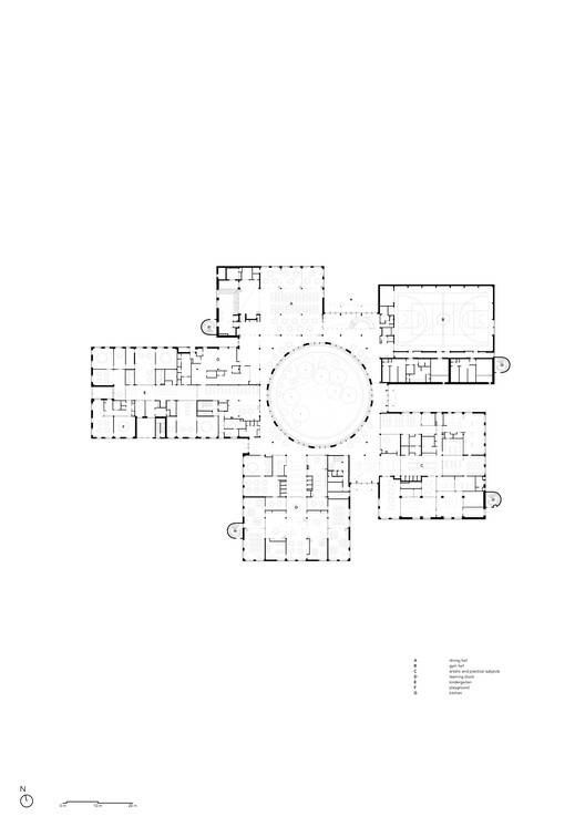 人性化的学习环境——从学习者的角度设计,学校提供了一个绿色灵活的学习环境,支持健康、专注和创造力。由共享的中心公共区域连接的不同构建块为人类规模的学习环境创建了一个框架,在这个环境中,所有年龄段的学习者都可以轻松地导航、结识他人并相互学习。高效的布局确保所有功能都在建筑中央空间和入口的短距离内。五个街区中的每一个都有自己独特的特点,并拥有各种功能,包括学习空间、食堂、体育馆、科学和艺术设施以及幼儿园。这座多功能建筑也是当地居民在晚上和周末的社区中心。适应性强的学习空间,带有可移动的隔板,可以重新配置以适应不同的活动,并易于调整以满足学习者的需求。木材和其他天然材料在整个建筑中得到了大量使用,加强了与自然的联系,并帮助创造了一个吸引人的、平静的环境,让所有学习者都有宾至如归的感觉。