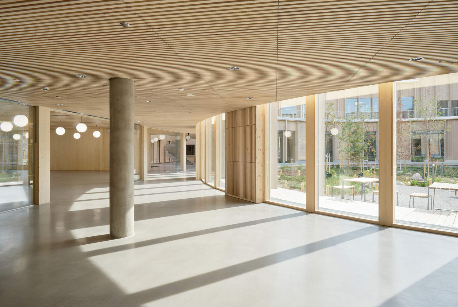 Green courtyard at the heart of the school - The circular courtyard introduces a significant green outdoor space at the heart of the school that enhances the learning environment and provides added value beyond the original program. In addition to serving as a peaceful outdoor area, it brings natural light to the center of the building and all common areas. The green courtyard and the bright lobby, with its tactile wooden interior, serve as focal points for social gatherings and circulation in the school. The school's green outdoor learning spaces, featuring local Finnish plants, are a central part of its pedagogy, helping to strengthen the children's understanding of nature's processes and inspiring them to contribute to a more sustainable future.