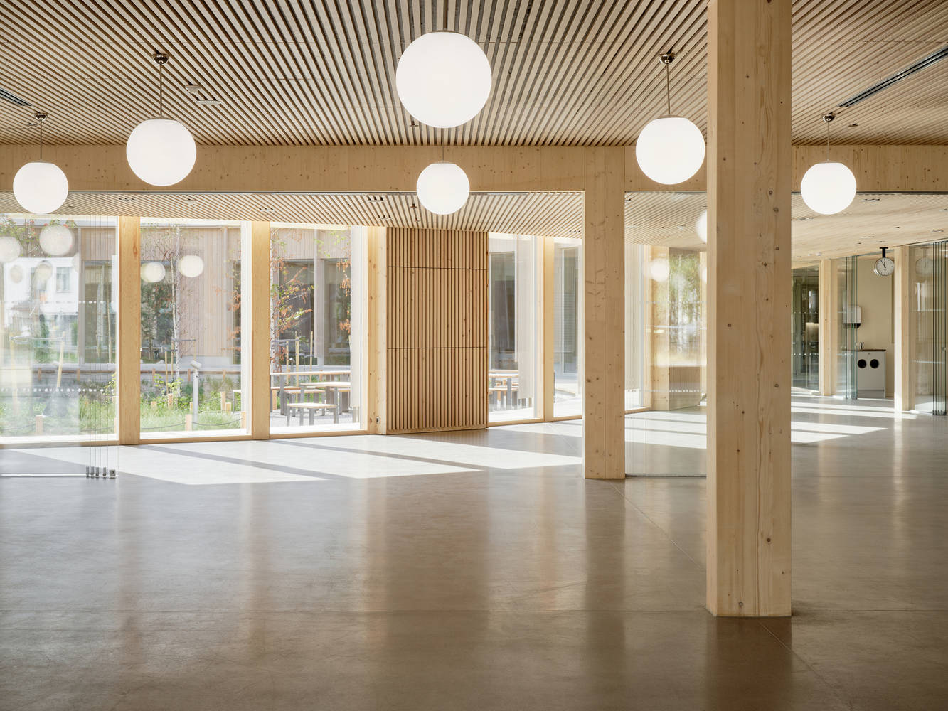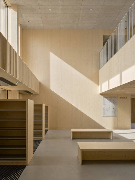 Human-scale learning environment - Designed from a learner's perspective, the school provides a green and flexible learning environment that supports well-being, concentration, and creativity. The distinct building blocks, connected by shared central common areas, create a framework for a human-scale learning environment where learners of all ages can easily navigate, meet others, and learn from one another. The efficient layout ensures that all functions are within a short distance of the building's central space and entrances. Each of the five blocks has its own unique character and houses a variety of functions, including learning spaces, a canteen, a sports hall, science and art facilities, and a kindergarten. The multifunctional building also serves as a community center for local residents in the evenings and on weekends. The adaptable learning spaces, with movable partitions, can be reconfigured to suit different activities and easily adjusted to meet the learners' needs. Wood and other natural materials are generously used throughout the building, reinforcing the connection to nature and helping create an inviting, calm environment where all learners feel at home.
