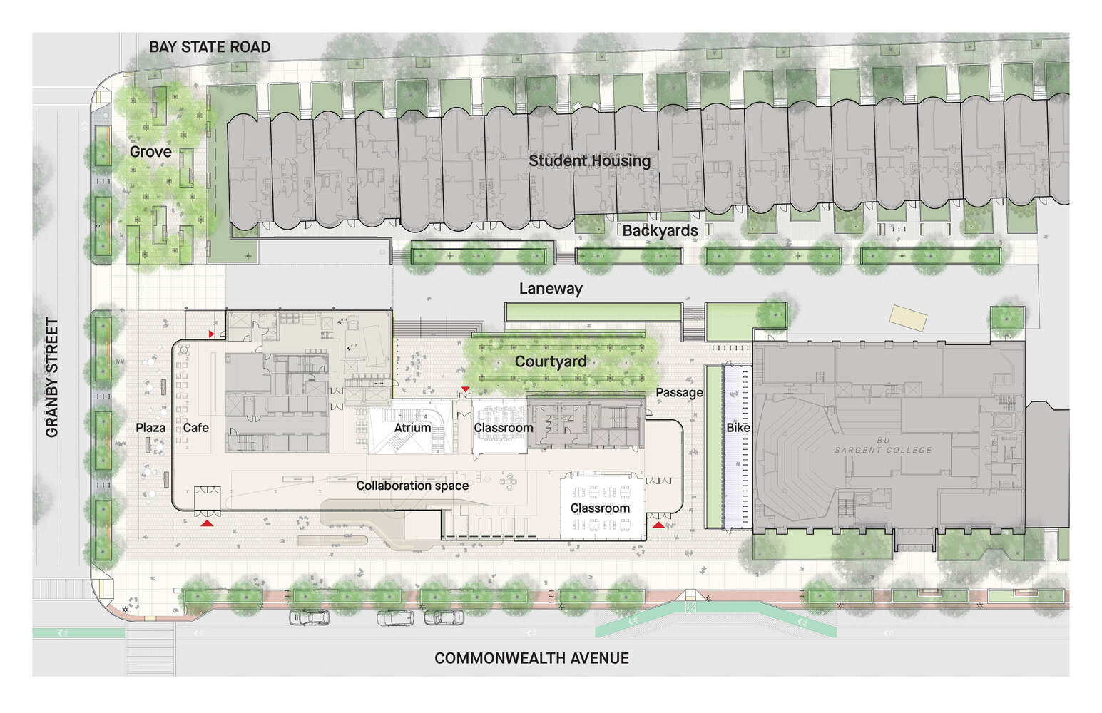 可持续发展-树立新标杆:该中心为未来学术建筑树立了可持续发展的新先例。目标是获得 LEED 白金认证,采用地热闭环系统、可再生能源和替代能源,如地下水补给系统和外部遮阳系统。这与波士顿大学的气候行动计划相契合,到 2040 年将碳排放量减少到零。绿色屋顶和露台也加强了与自然环境的连接。