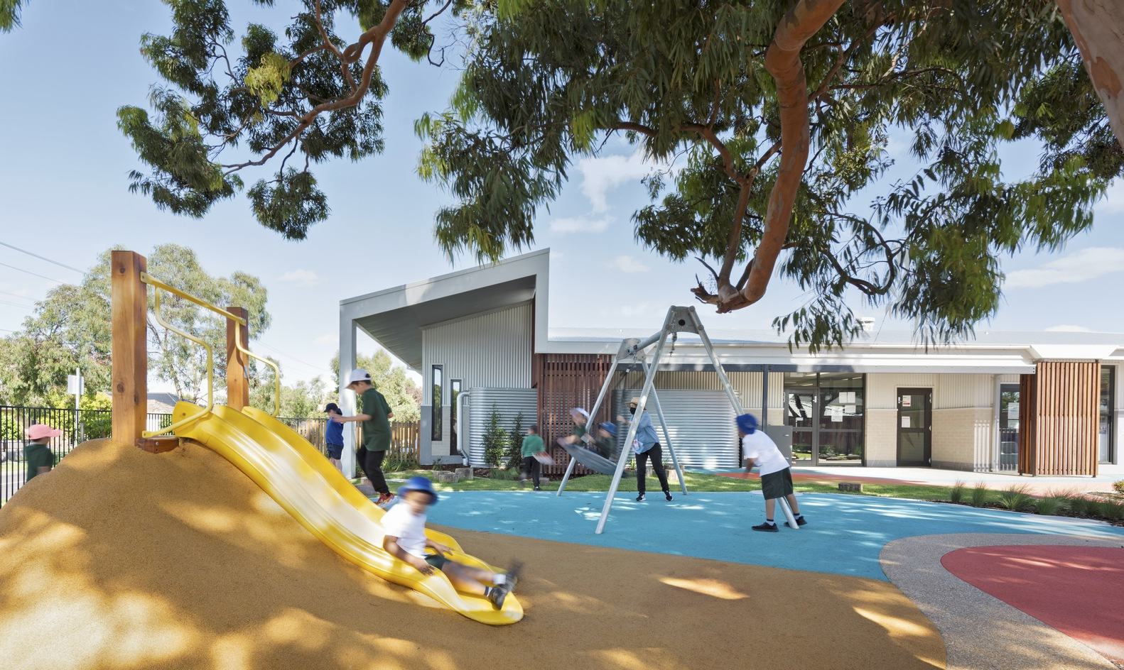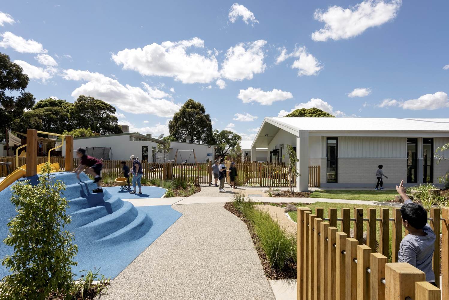 Text description provided by the architects. Guymer Bailey were engaged to design a masterplan and first-stage development of new educational facilities for Western Autistic School's Niddrie campus, now independently known as Niddrie Autistic School. The brief of works entailed demolishing a classroom block, site amenities and playgrounds that remained underdeveloped for twenty-five years. Originally a mainstream school, the aging facilities were failing to accommodate modern criteria for special needs learning and ill-suited to face unique challenges for young children with ASD (autism spectrum disorder).