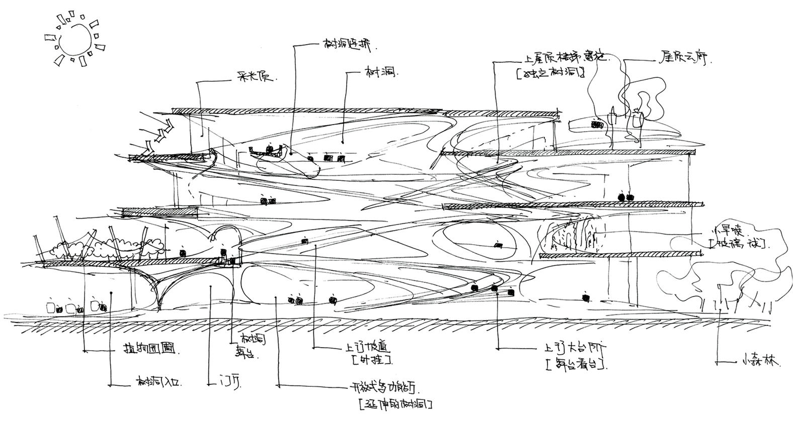 建筑师提供的文字描述Text description provided by the architects. Grin Sunray Kindergarten, dreaming Space in a Tree Hole. Design starts with a tree. We hope to create a tree that only exists in fairy tales and cartoons. The children climbed up and down and looked at each other. The children would have the chance to explore different tree cave spaces, sit in rows and chat about the world they discover. Caves are the most primitive form of architecture and the most innocent way for children to perceive space. We want this to be the place where children's dreams begin.
