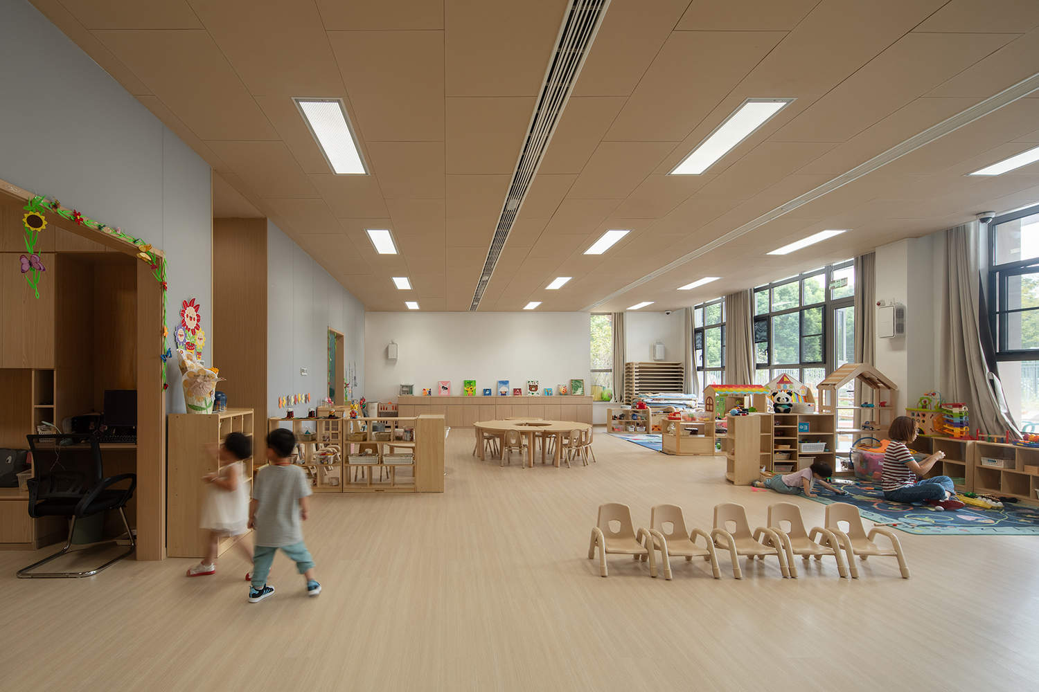 The sun-filled atrium, with its curved surface encircling the children, is the space's center and the starting point for exploration. The texture and shape of the atrium are designed in a smoothly curved combination so that it feels like being in a valley. The friendly and warm wooden texture allows every child to touch it at will. Caves in different sizes and shapes are the outposts for discovering fun things. The corridors connecting the atrium and the functional rooms while the staircase windows look at each other, creating more surprises for the children to play around with, also serve as the buffer and linking layer in the space, just like "branches" according to "Big Tree".