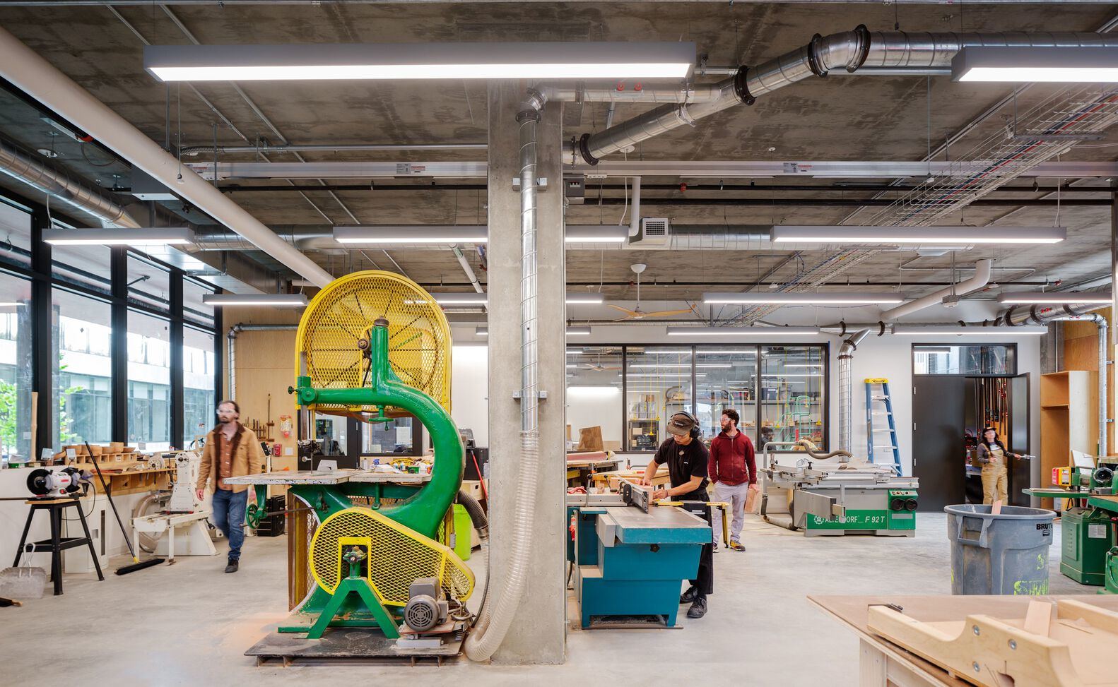 The design also supports CCA's commitment to sustainability through strategies that serve environmental and experiential purposes. The hybrid mass timber structure and minimal finishes reduce the building's embodied carbon footprint by almost half that of a typical baseline building. Physically intensive practices with heavy equipment are strategically located to concentrate structural loads and mechanical infrastructure on the ground level as well as provide adaptability as new needs, mediums, and technologies develop. Other passive design strategies, such as self-shading façades and night-flush ventilation, naturally cool the building to reduce the size and energy demand of mechanical systems. The building also has infrastructure in place to enable a closed-loop, net-positive building in the future.