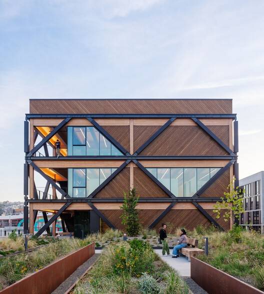 木结构与可持续发展的融合:建筑中的两个大型木亭是一大亮点。作为加利福尼亚州首批暴露的大型木结构之一,其独特的偏心支撑框架系统展现了自然物质性。同时,设计通过混合大块木材结构和被动设计策略,减少了建筑的碳足迹,支持了可持续发展的承诺。这为未来建筑的可持续发展提供了优秀的范例。